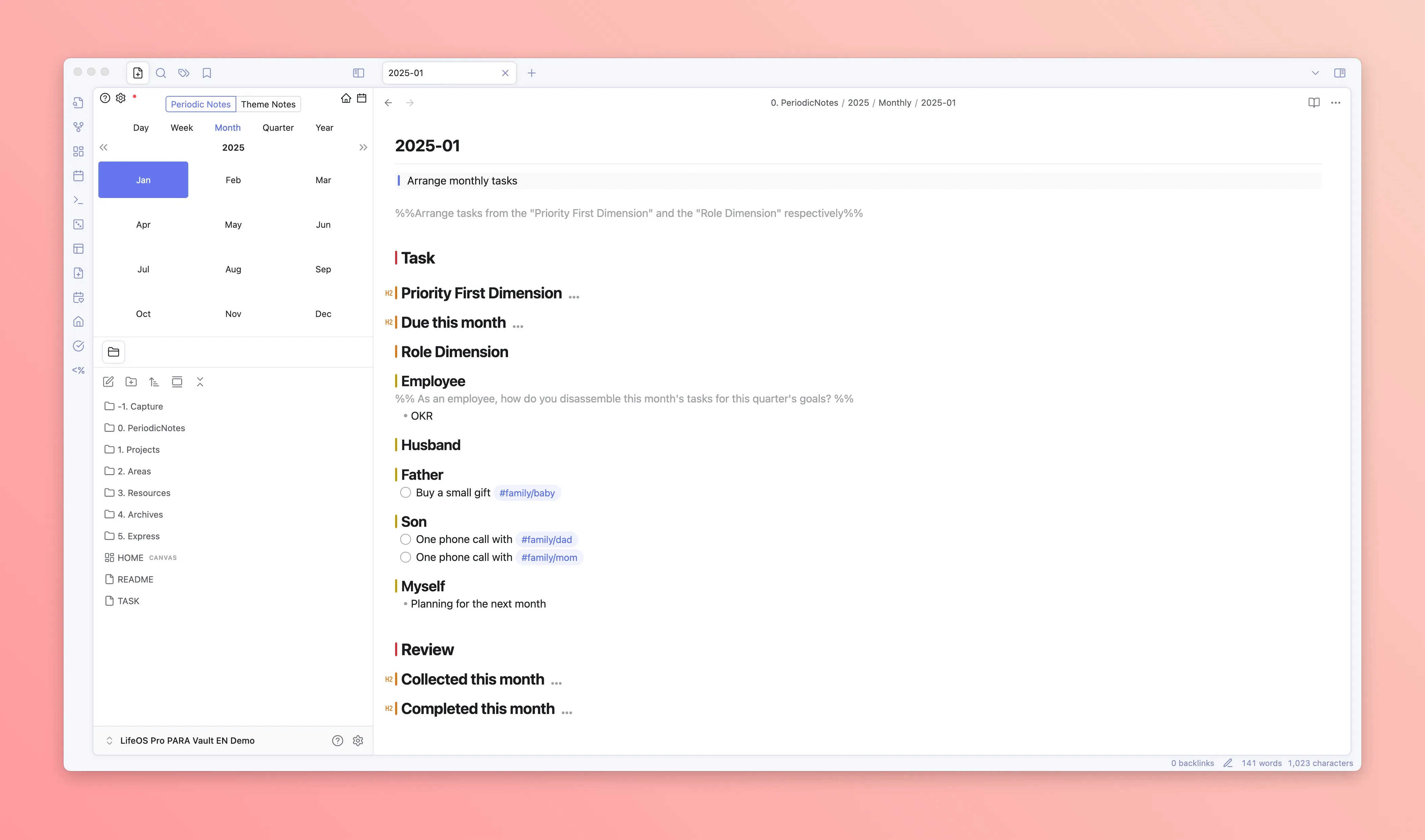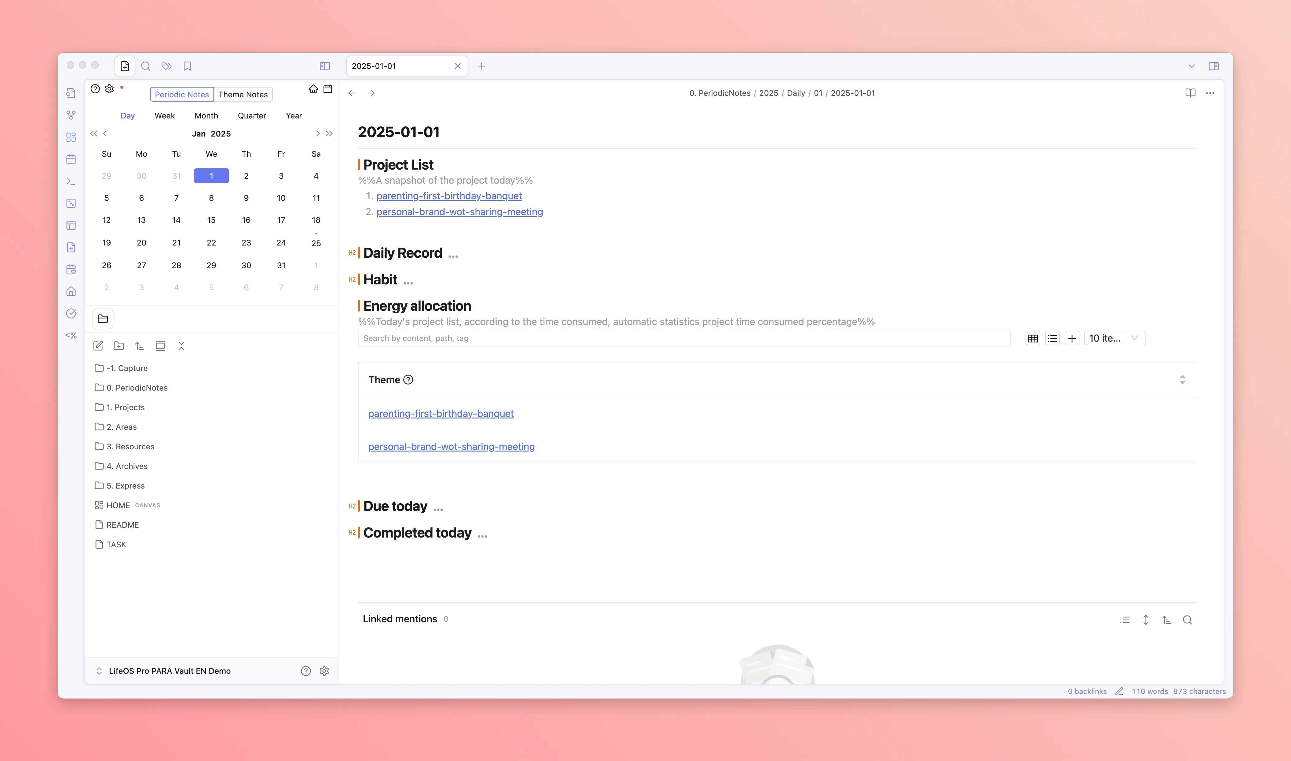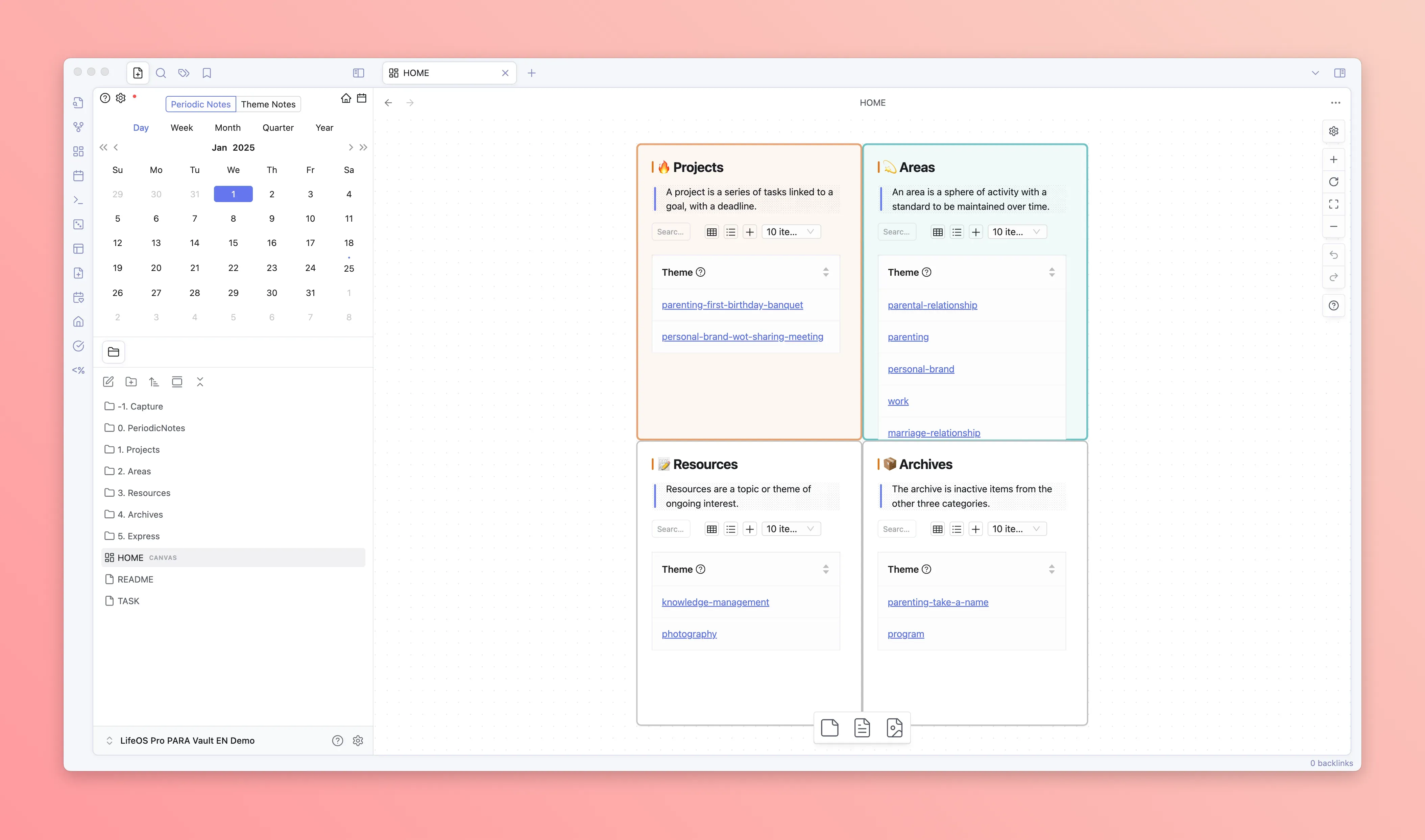 LifeOS's core adopts two systems: one is the theme note system, and the other is the periodic note system. The former generally uses the PARA organizational method, managing knowledge by dimensions such as "Projects", "Areas", "Resources", while the latter uses time as a dimension, managing tasks/goals/time through recording "Daily Notes", "Weekly Notes", "Monthly Notes", "Quarterly Notes", "Yearly Notes".