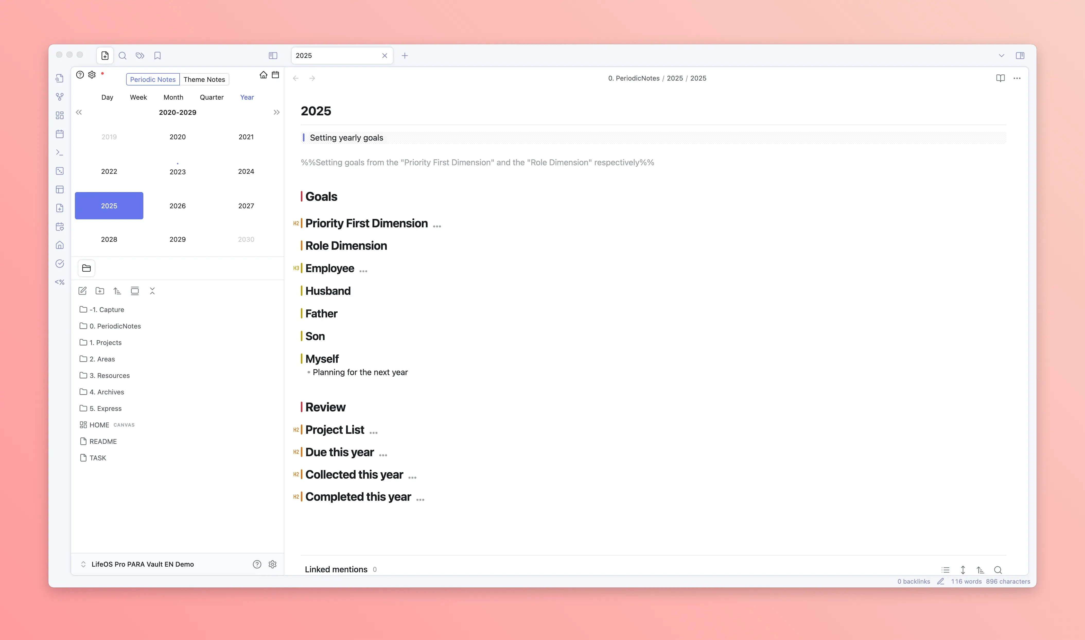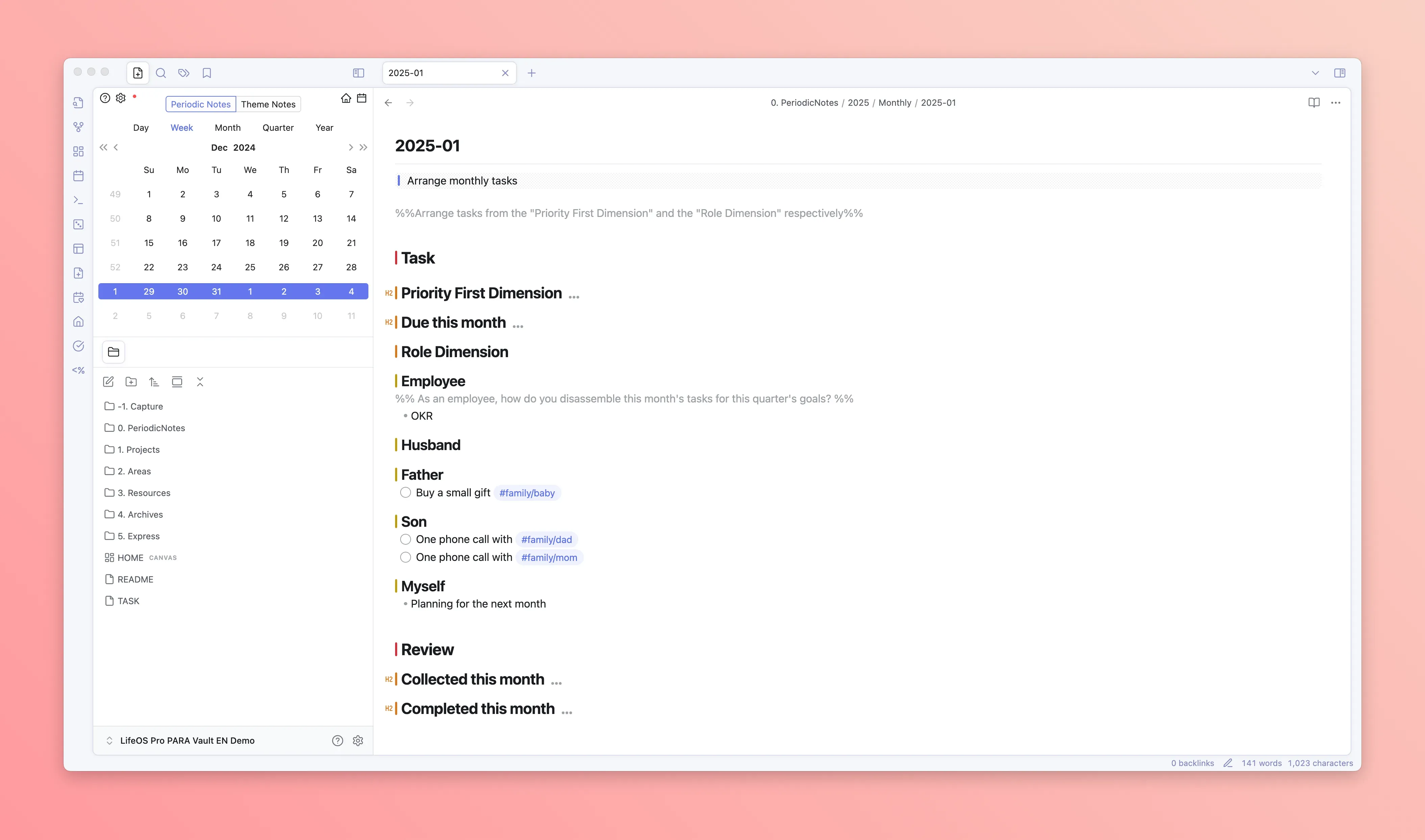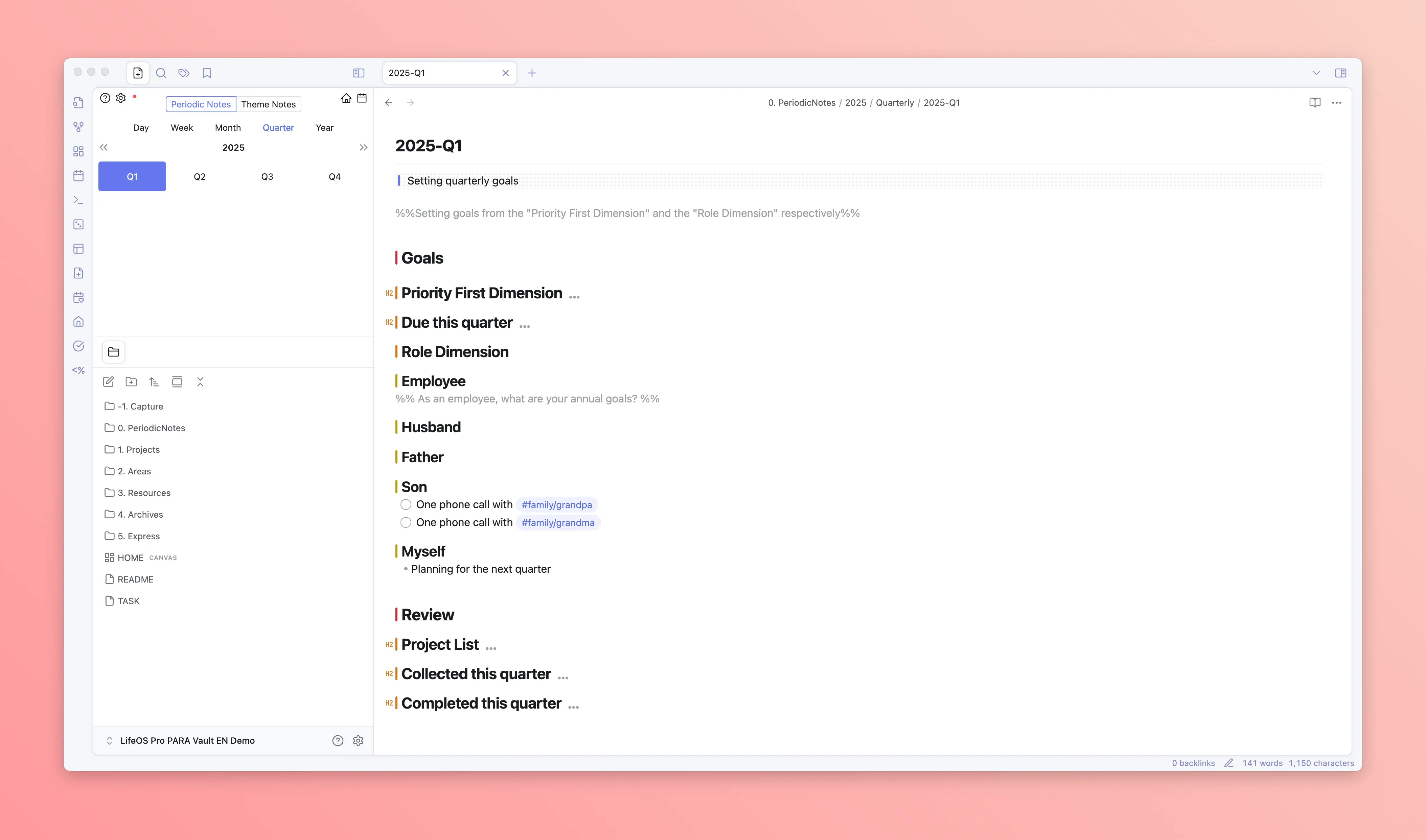 LifeOS's core adopts two systems: one is the theme note system, and the other is the periodic note system. The former generally uses the PARA organizational method, managing knowledge by dimensions such as "Projects", "Areas", "Resources", while the latter uses time as a dimension, managing tasks/goals/time through recording "Daily Notes", "Weekly Notes", "Monthly Notes", "Quarterly Notes", "Yearly Notes".