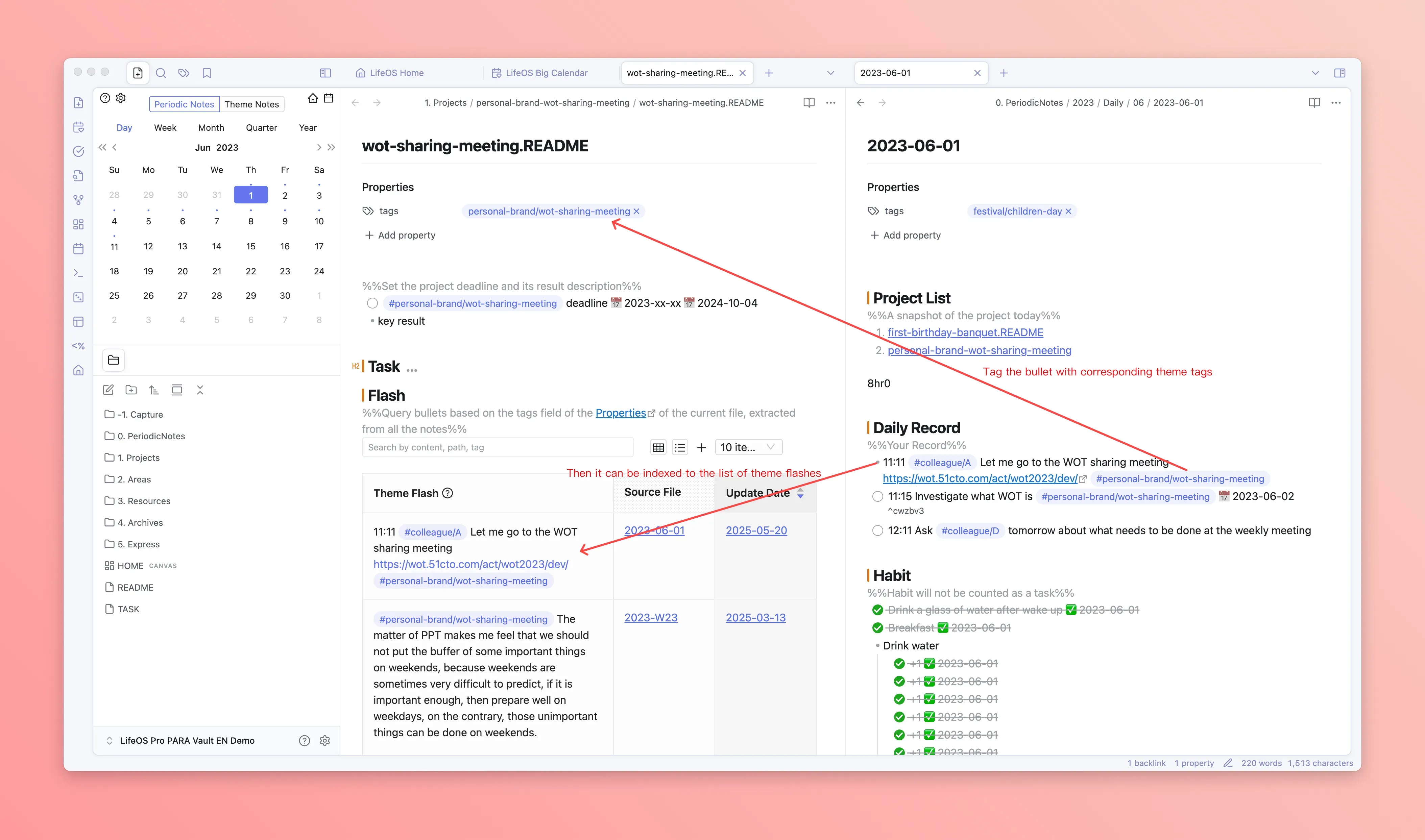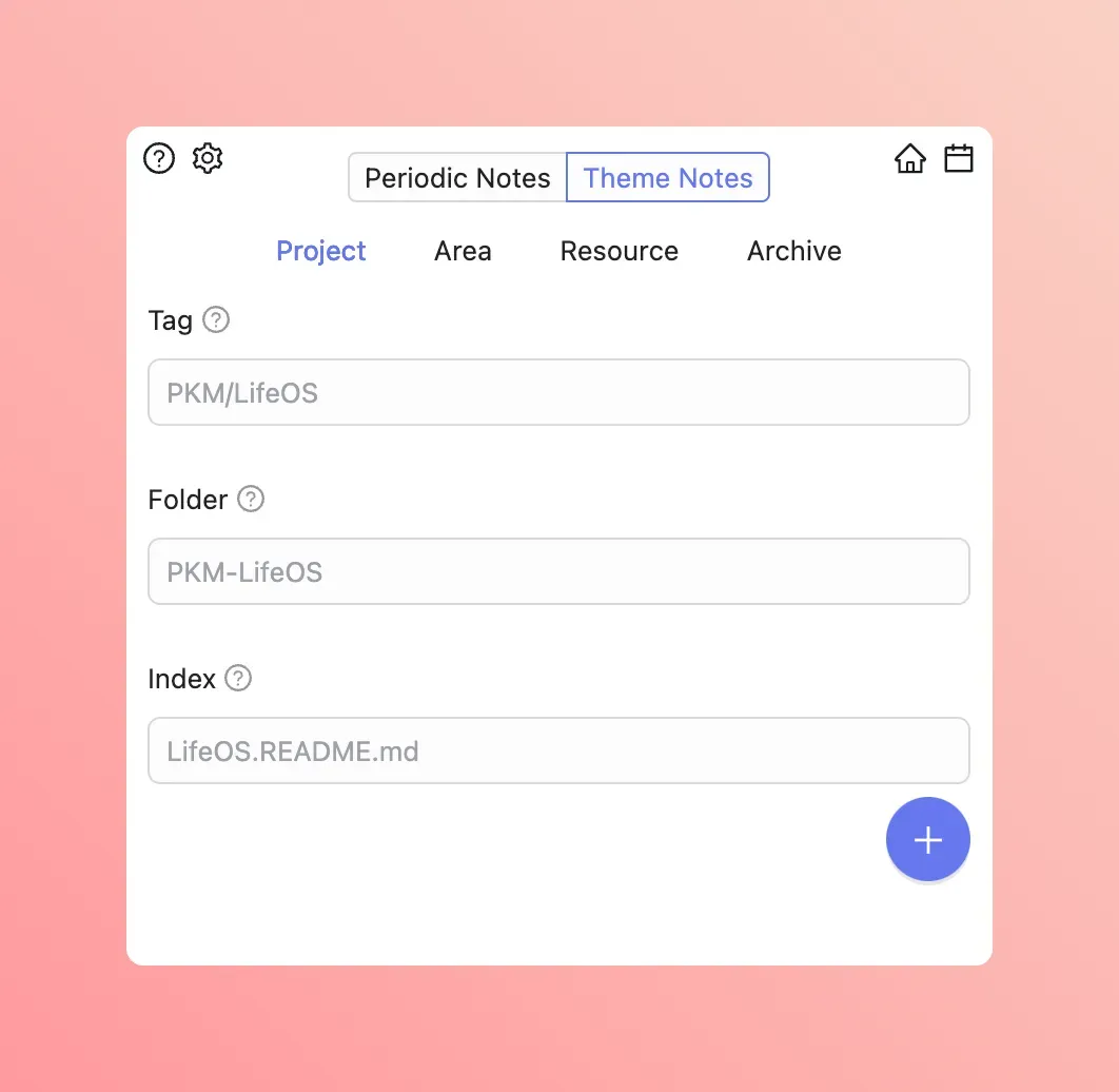 Refer to the diagram of "Theme Tags". Simply put, "Theme Notes" are used to index your "Fleeting Thoughts", "Tasks", and "Files" of "a certain theme" scattered in "Periodic Notes".