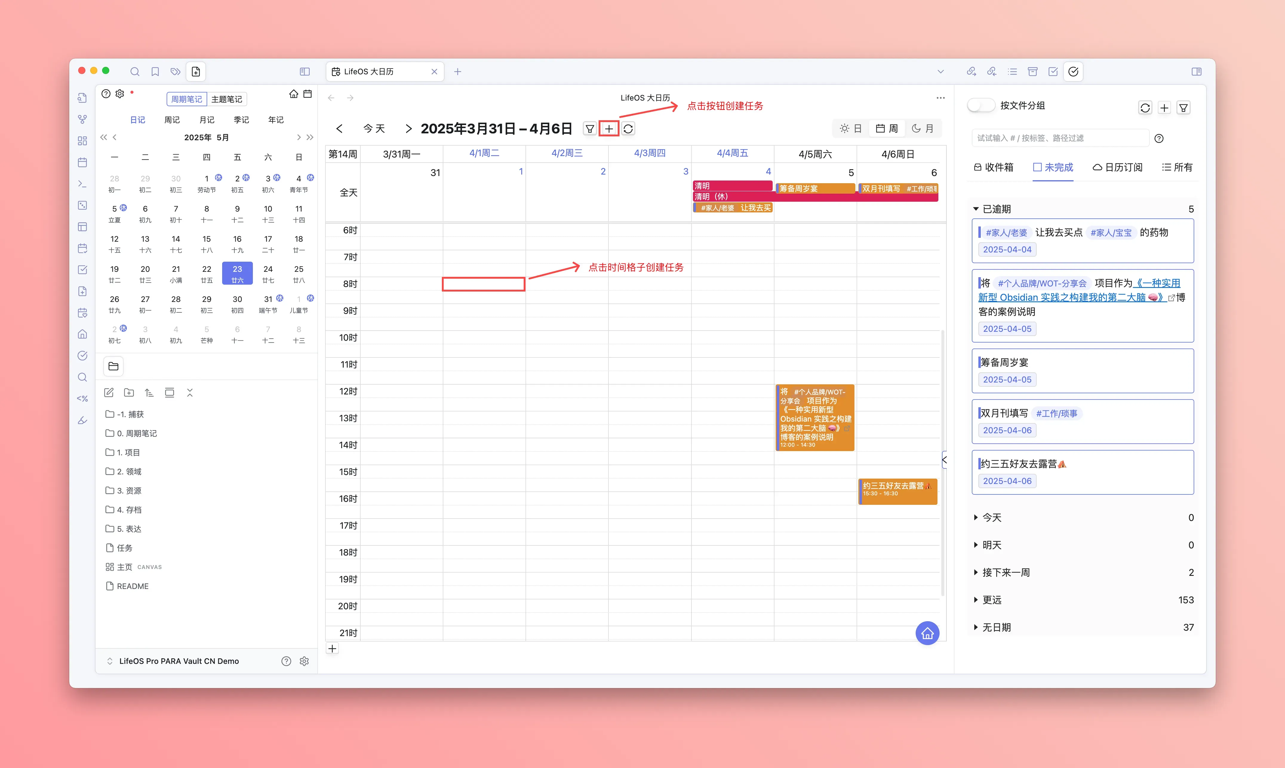 Supports multiple entry points for creating tasks — whether you're recording in notes, planning on the homepage, organizing in advanced lists, or scheduling in the big calendar, you can quickly create tasks anytime, anywhere. For details, see Task Creation.