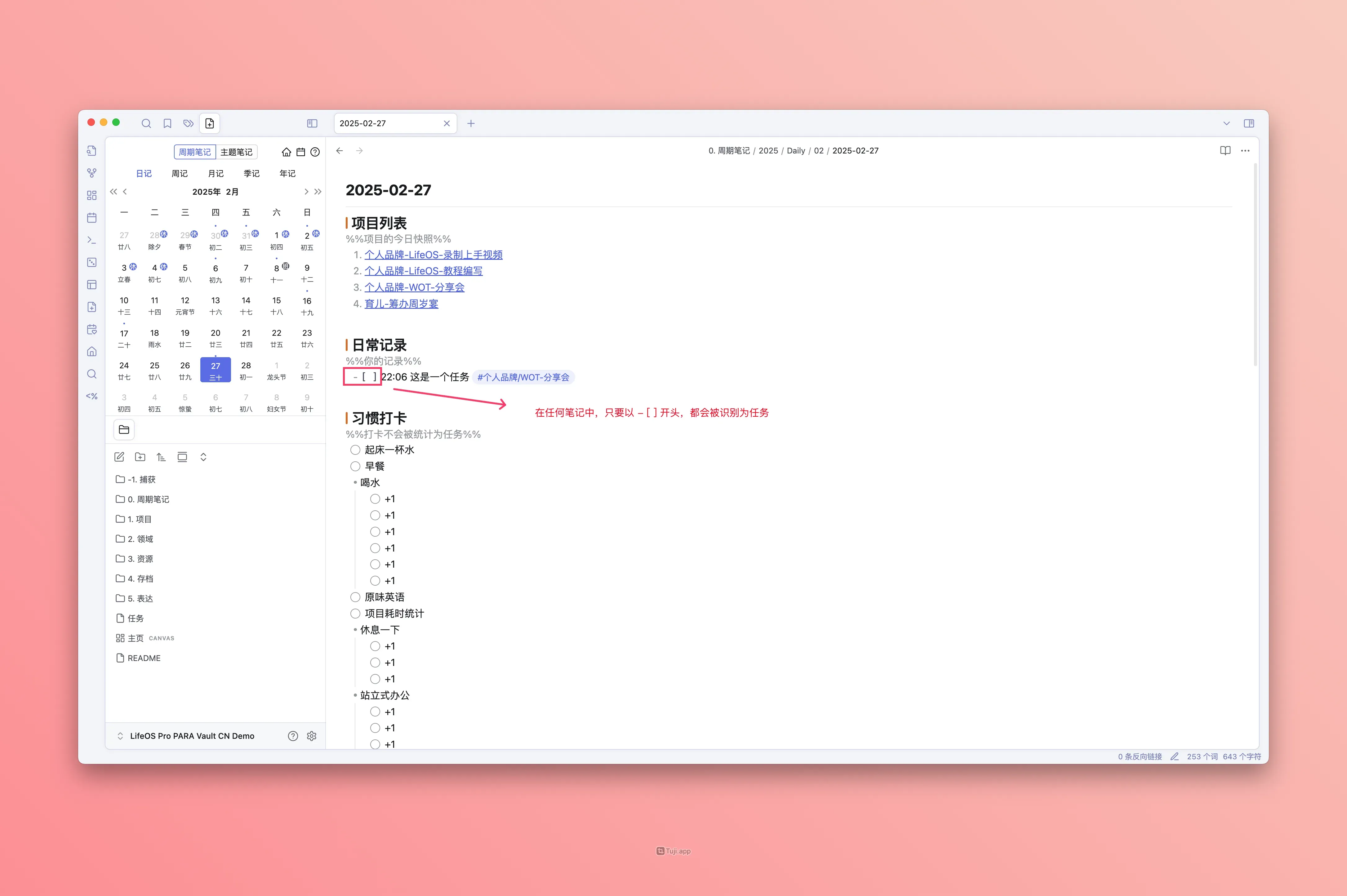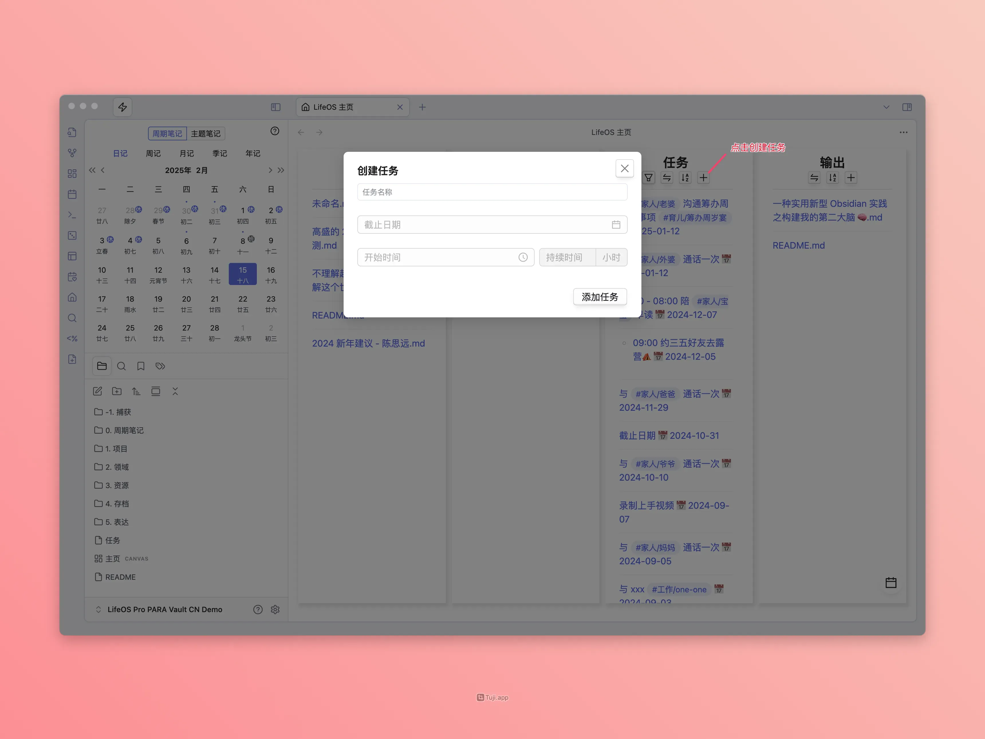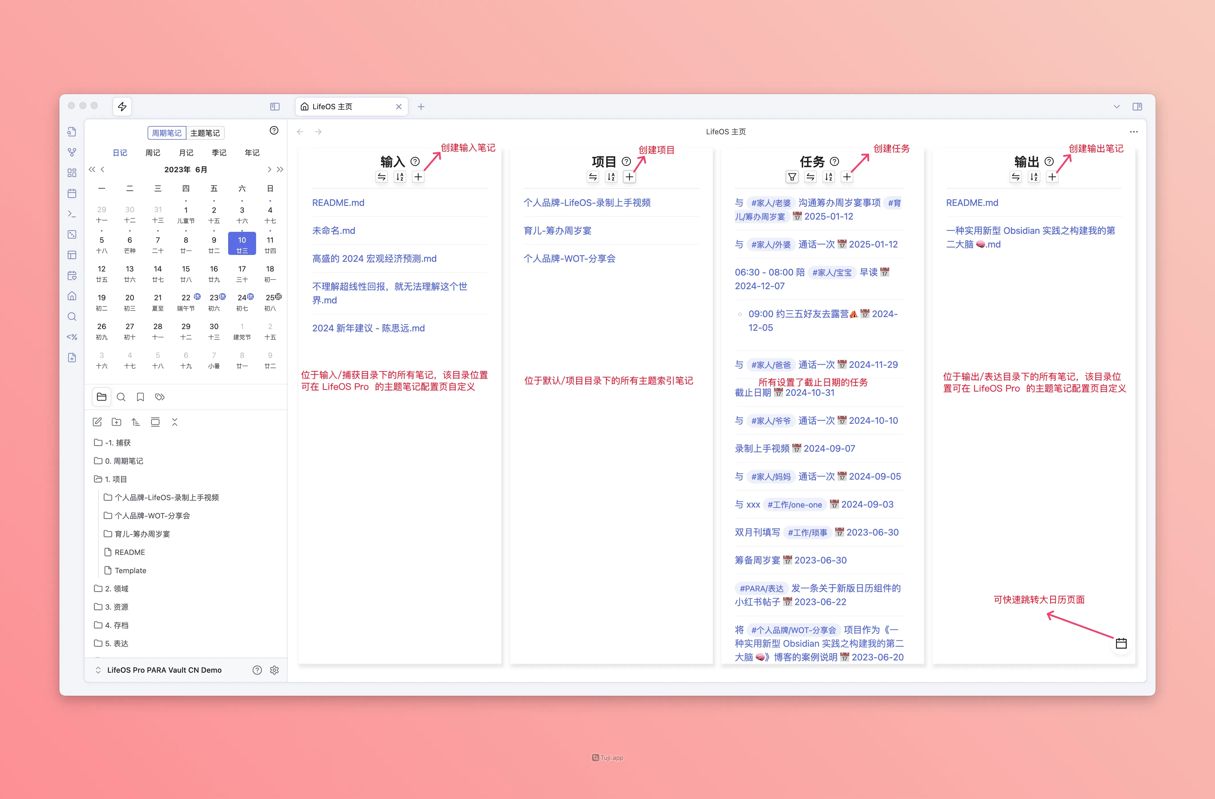 LifeOS aims to be your life system. The new homepage is simple and practical, giving you a clear overview of the system's inputs, projects (themes), tasks, and outputs, helping you better coordinate life and work.