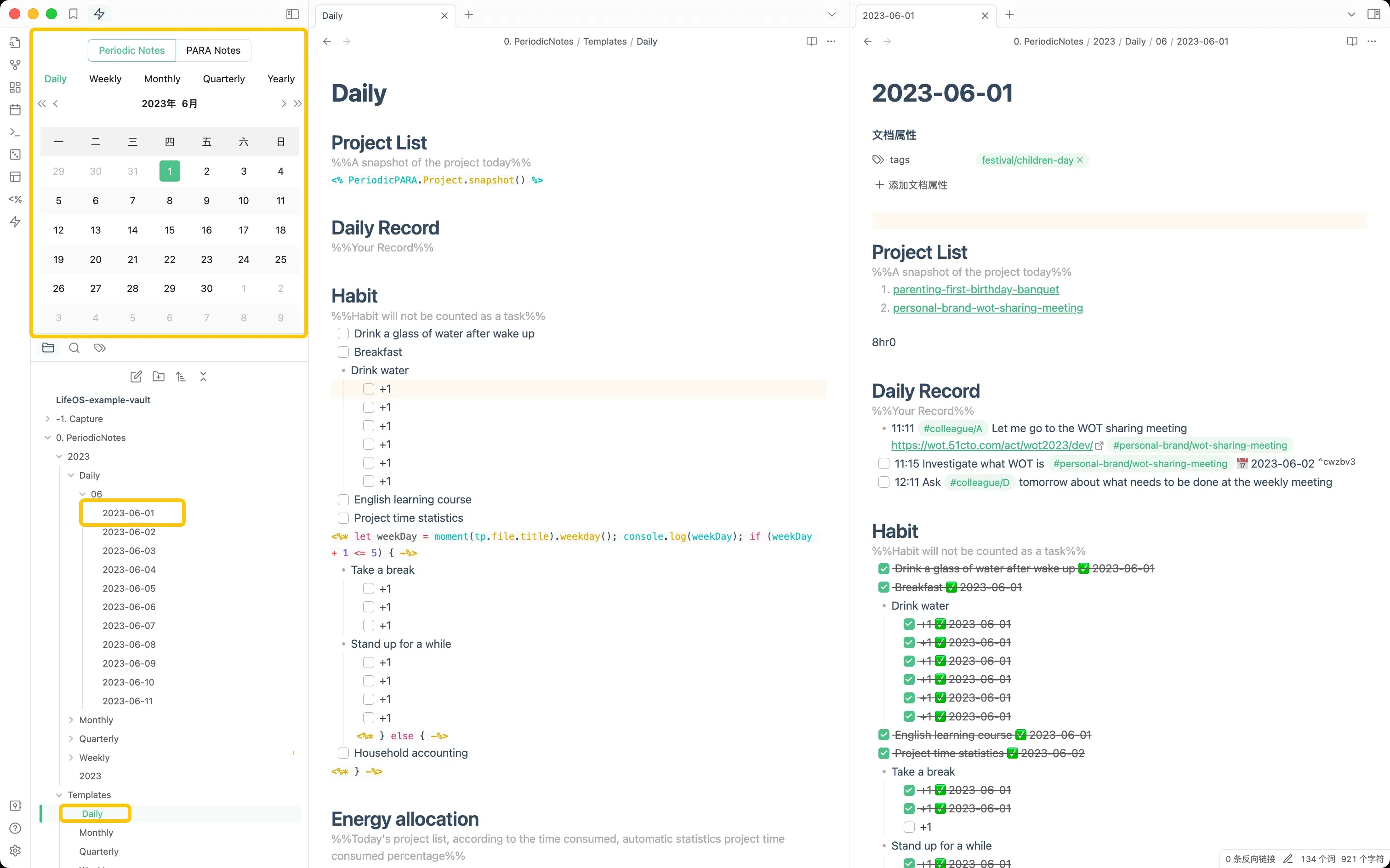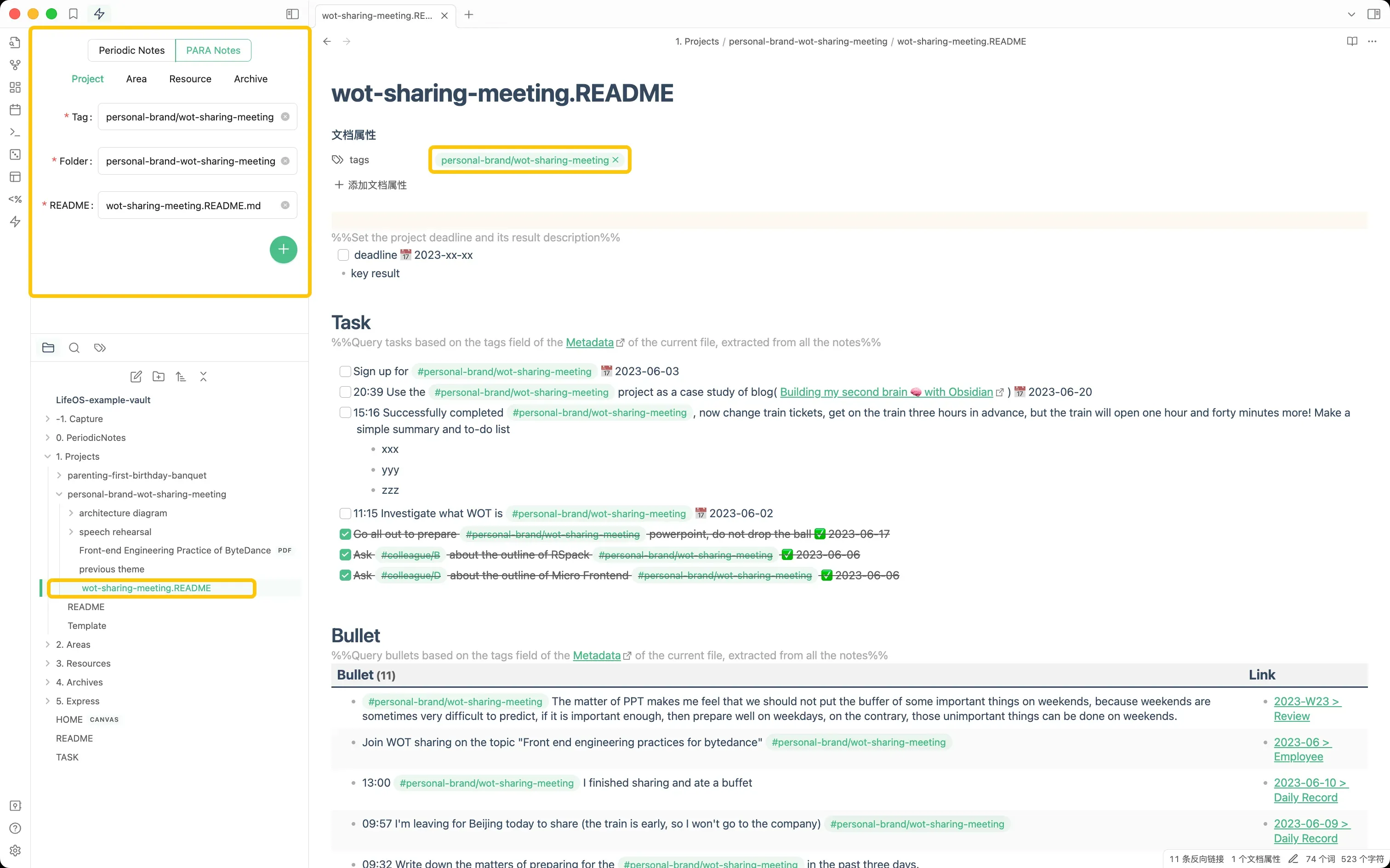 LifeOS works by writing markdown code block, which query project, area, task list according to the date parsed from current filename, and query task, bullet, file, project, area, resource, archive list according to the tags parsed from Properties.