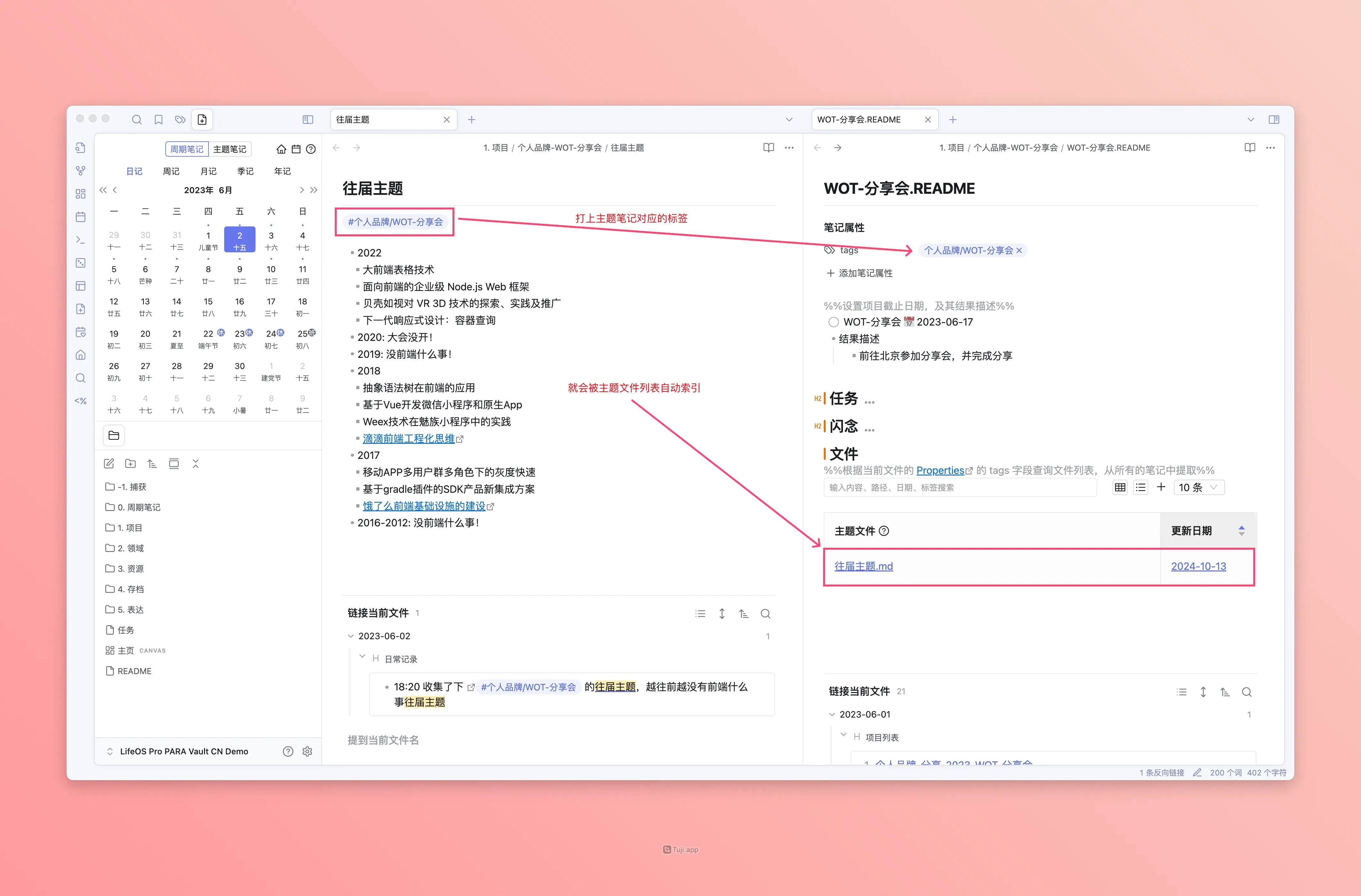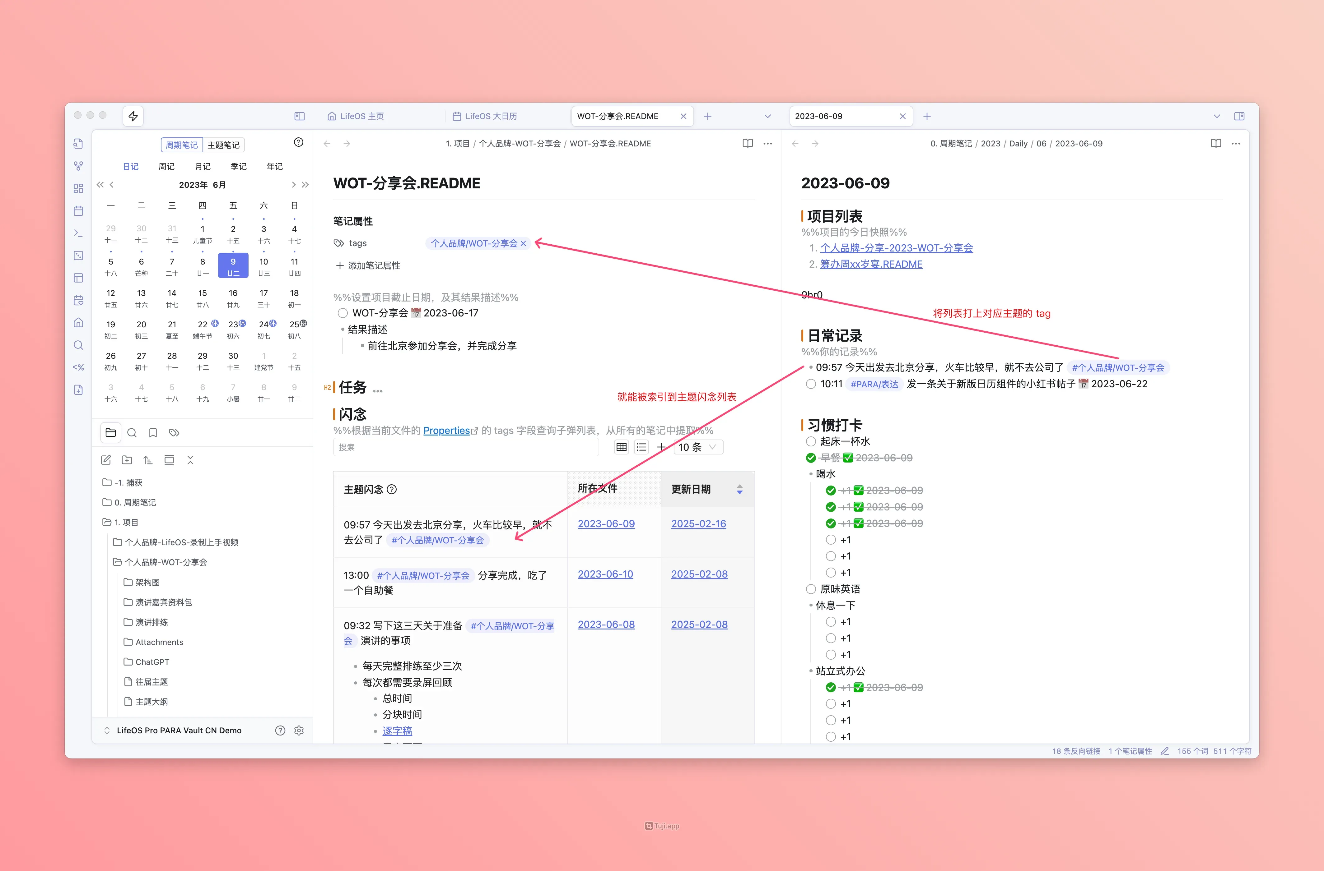 它的主要功能是用来索引某个主题下的任务、闪念笔记、文件,请观察如下图片,在任何地方记录的任务、闪念笔记、文件,只要打上了对应主题笔记的『主题标签』,则都会被收录到『主题笔记』的索引文件中,正是这个『自动收录』功能,让你真正做到『无压记录』,每当你在周期笔记,比如日记中记录一条『任务』和『闪念笔记』时,只要打上对应的『主题标签』,就能被收录啦!未来就能在『主题索引文件』里查看这些记录,这能让你十分方便地『找回』你记录的『碎片笔记』,『找回』方便才能『无压记录』!