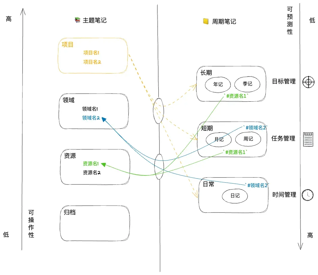 从图一中我们可以发现,对于主题笔记系统来说,从『归档』、到『资源』、到『领域』、再到『项目』,对『知识笔记』的可操作性越来越高,如何理解可操作性呢?比如相比『育儿』领域下一步要做什么,和『育儿-筹办满月酒』这个项目的下一步,显然后者更具备可操作性!
