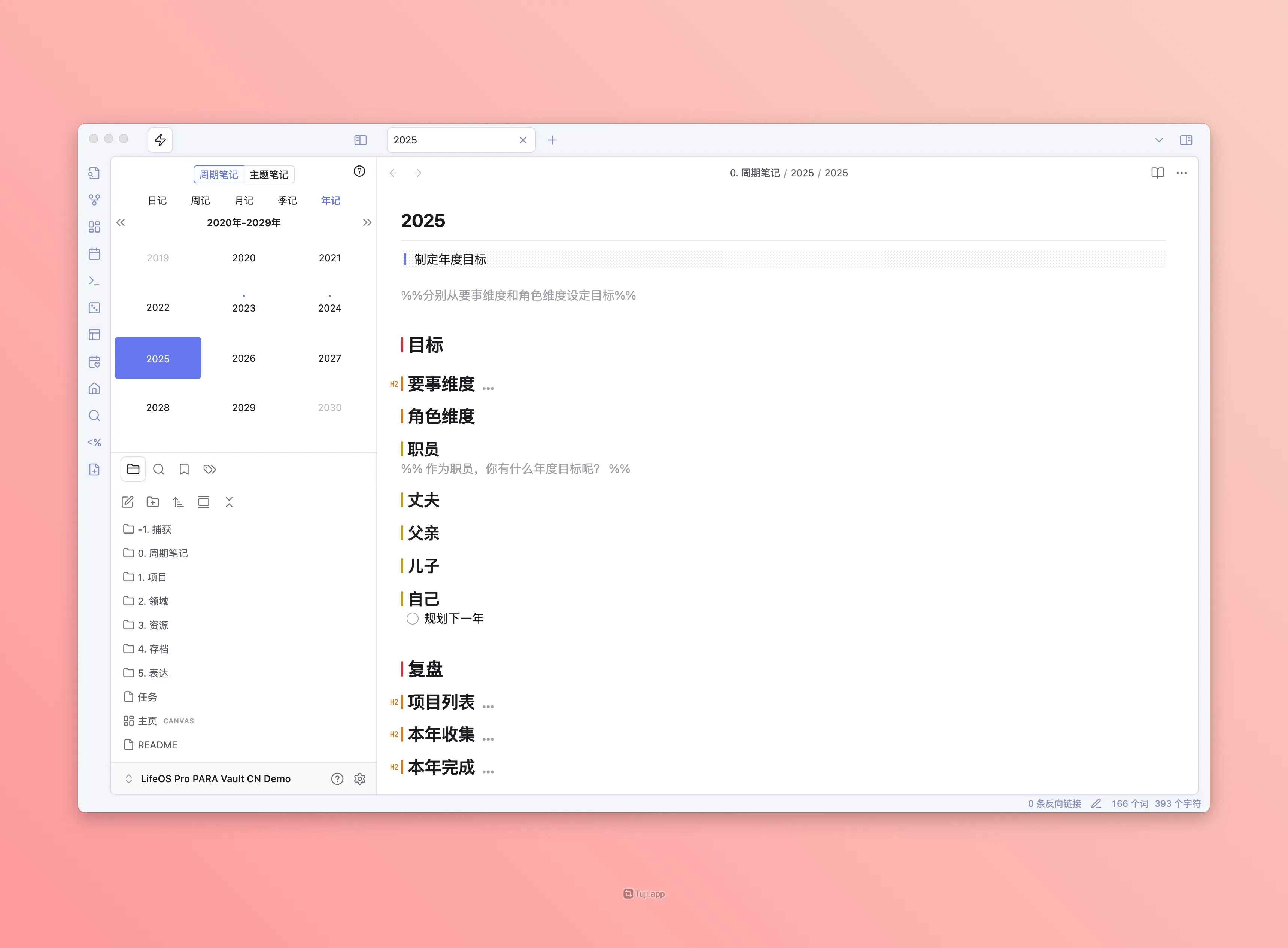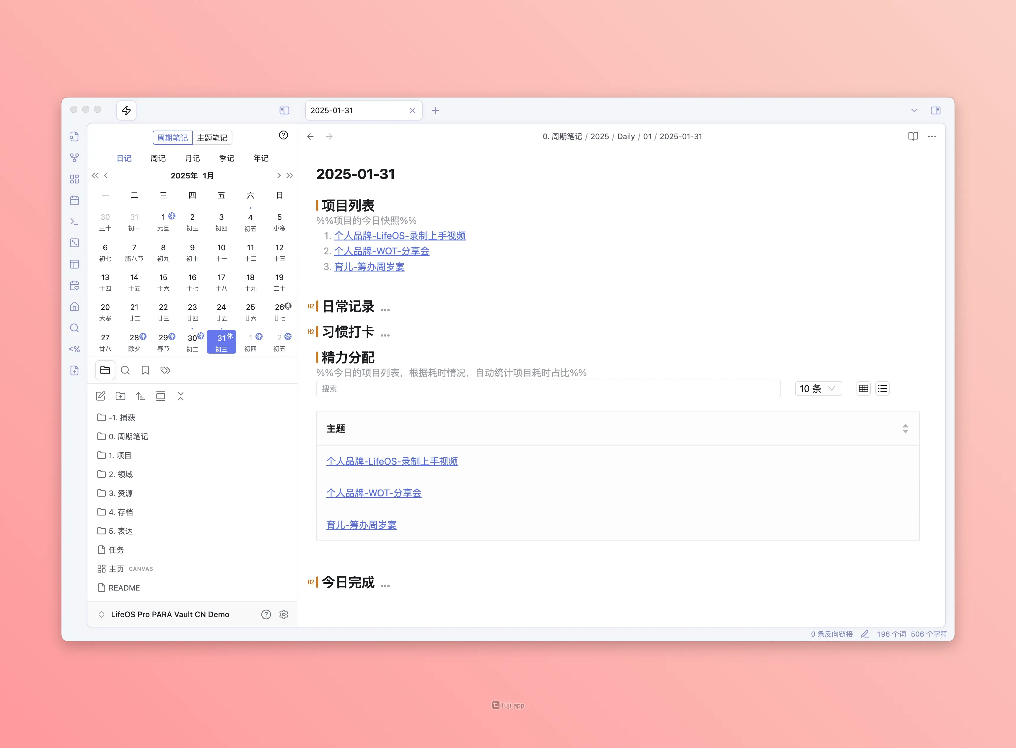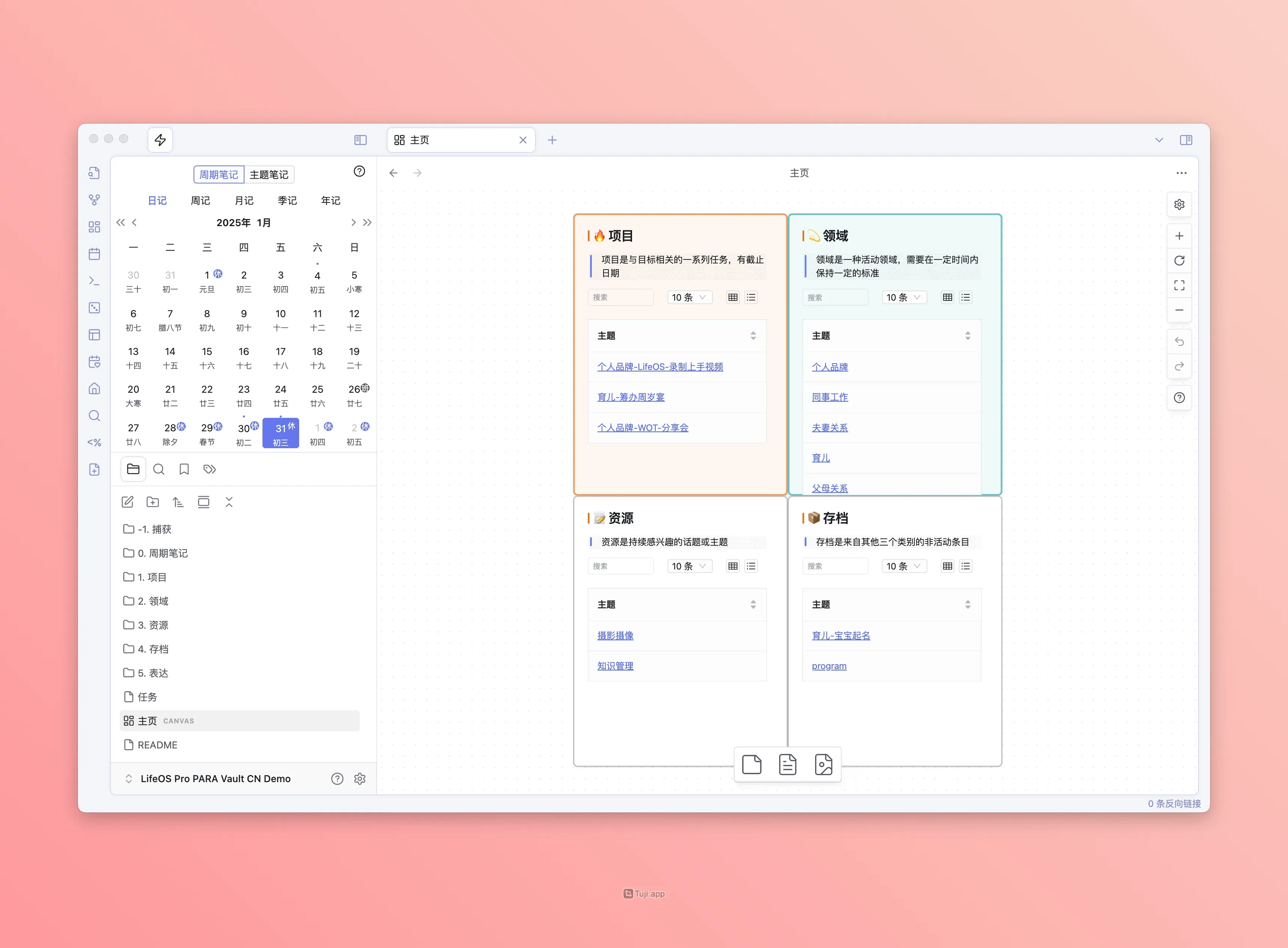 LifeOS 的核心采用两套系统,一个是主题笔记系统,另一个是周期笔记系统,前者一般采用 PARA 组织法,以『项目』、『领域』、『资源』为维度,进行知识管理,后者以时间为维度,通过记录『日记』、『周记』、『月记』、『季记』、『年记』,进行任务/目标/时间管理。
