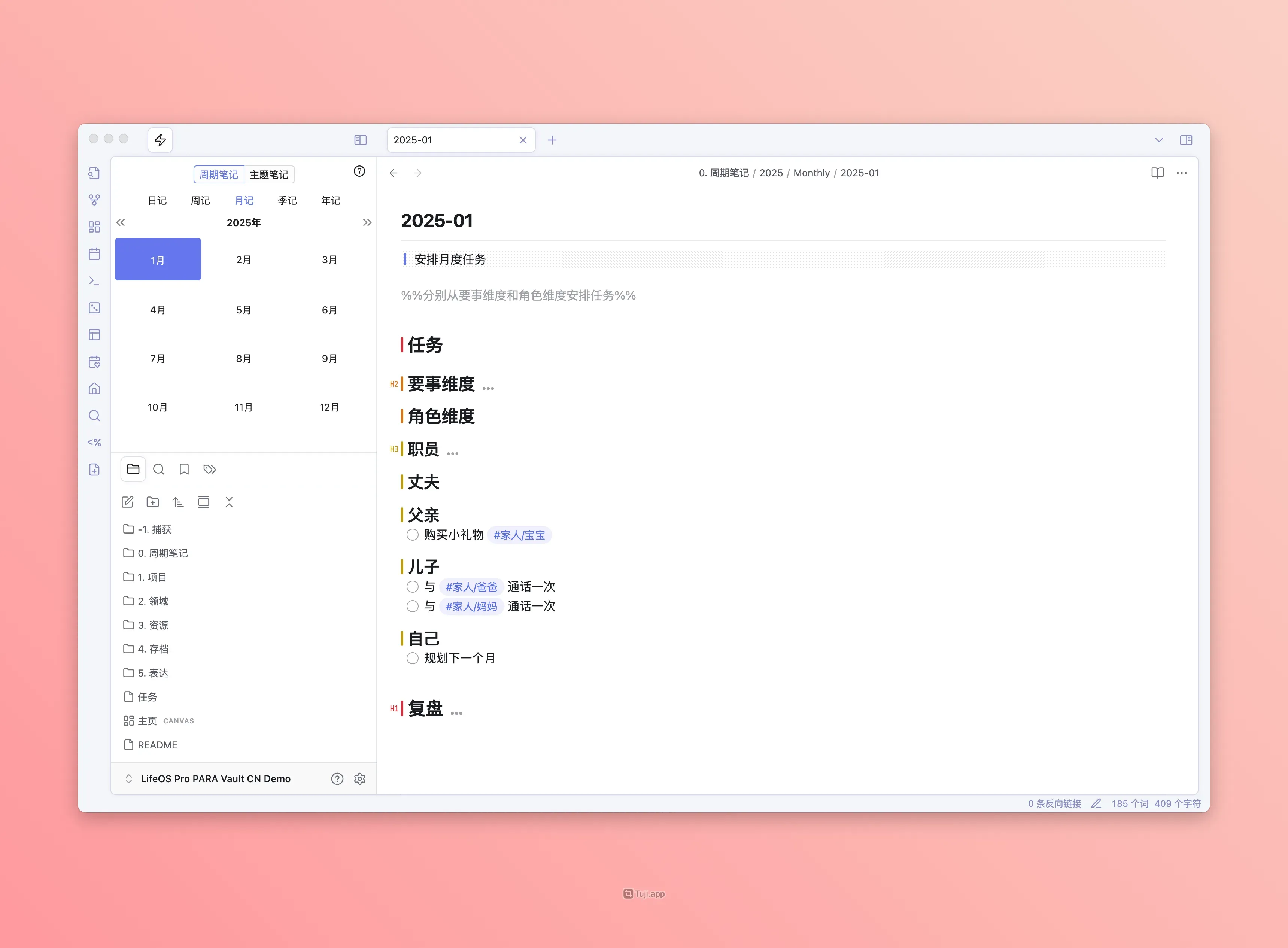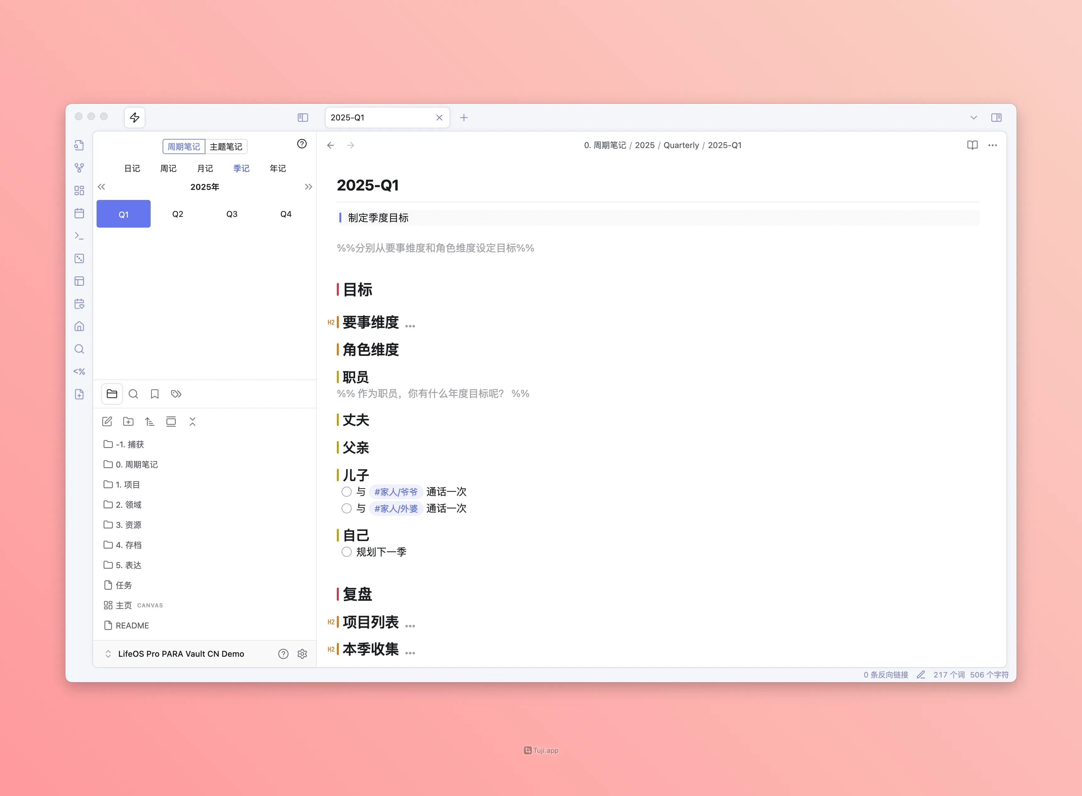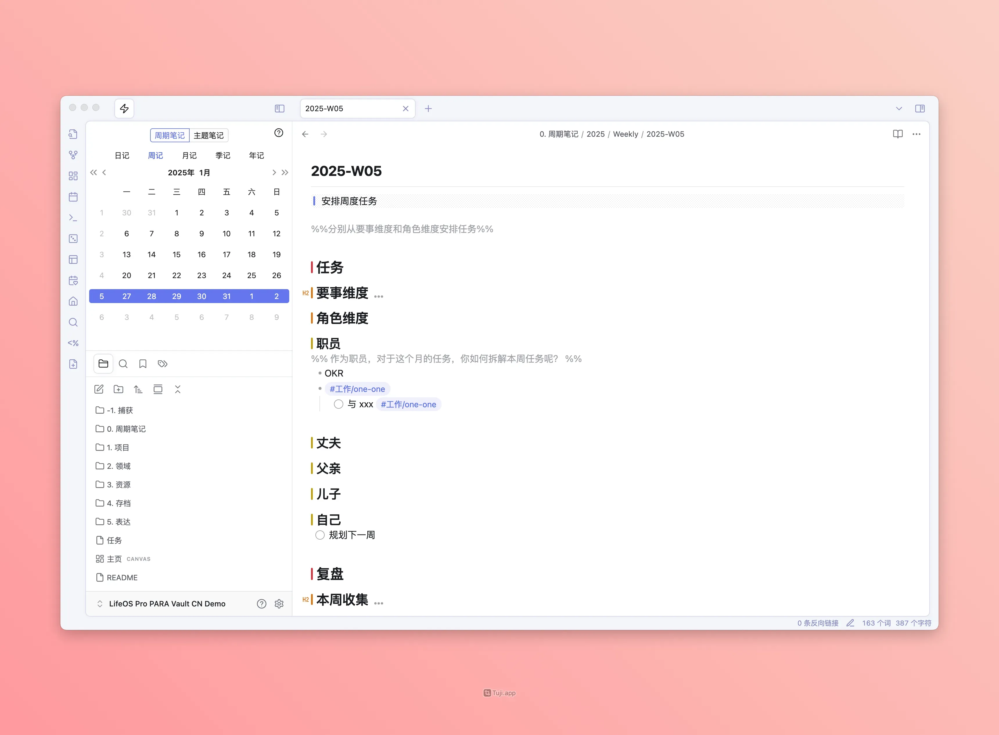 LifeOS 的核心采用两套系统,一个是主题笔记系统,另一个是周期笔记系统,前者一般采用 PARA 组织法,以『项目』、『领域』、『资源』为维度,进行知识管理,后者以时间为维度,通过记录『日记』、『周记』、『月记』、『季记』、『年记』,进行任务/目标/时间管理。