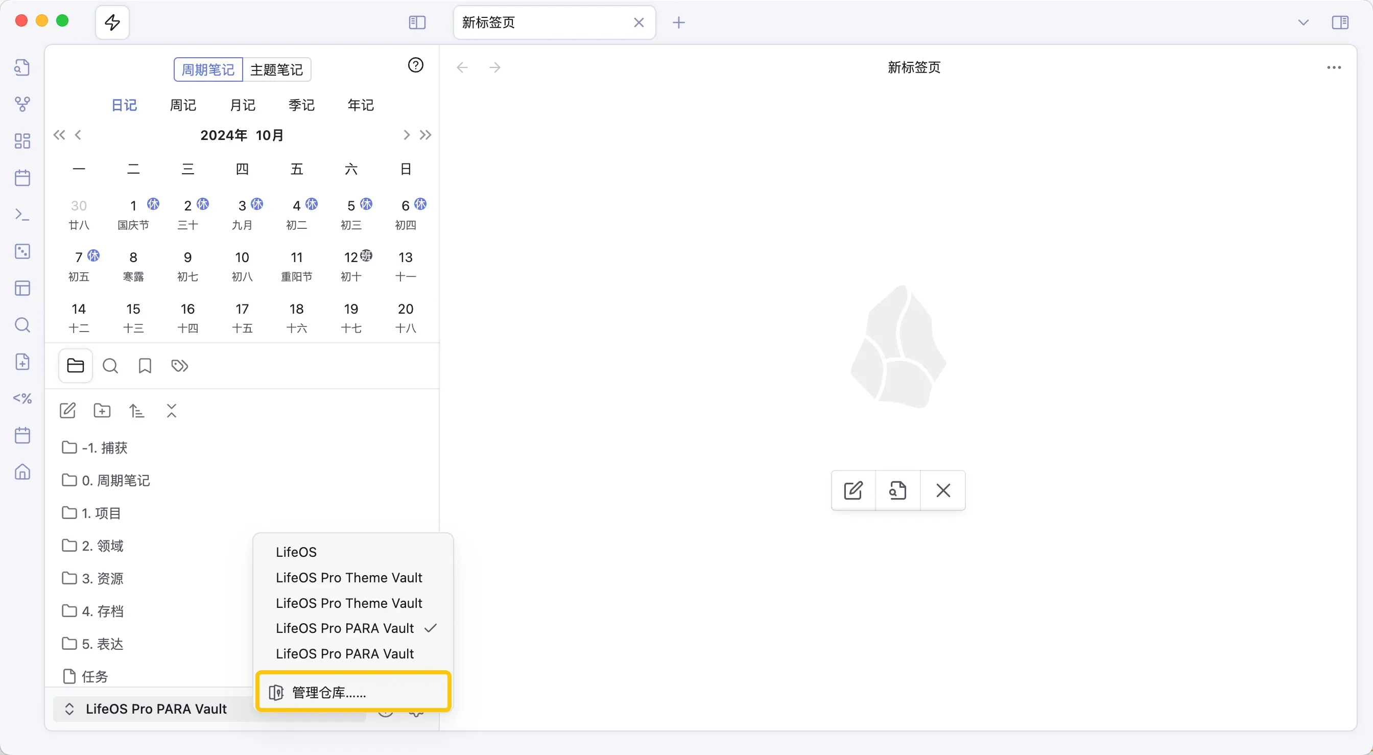 打开 Obsidian 软件,点击左下角切换库,接着点击『管理仓库』