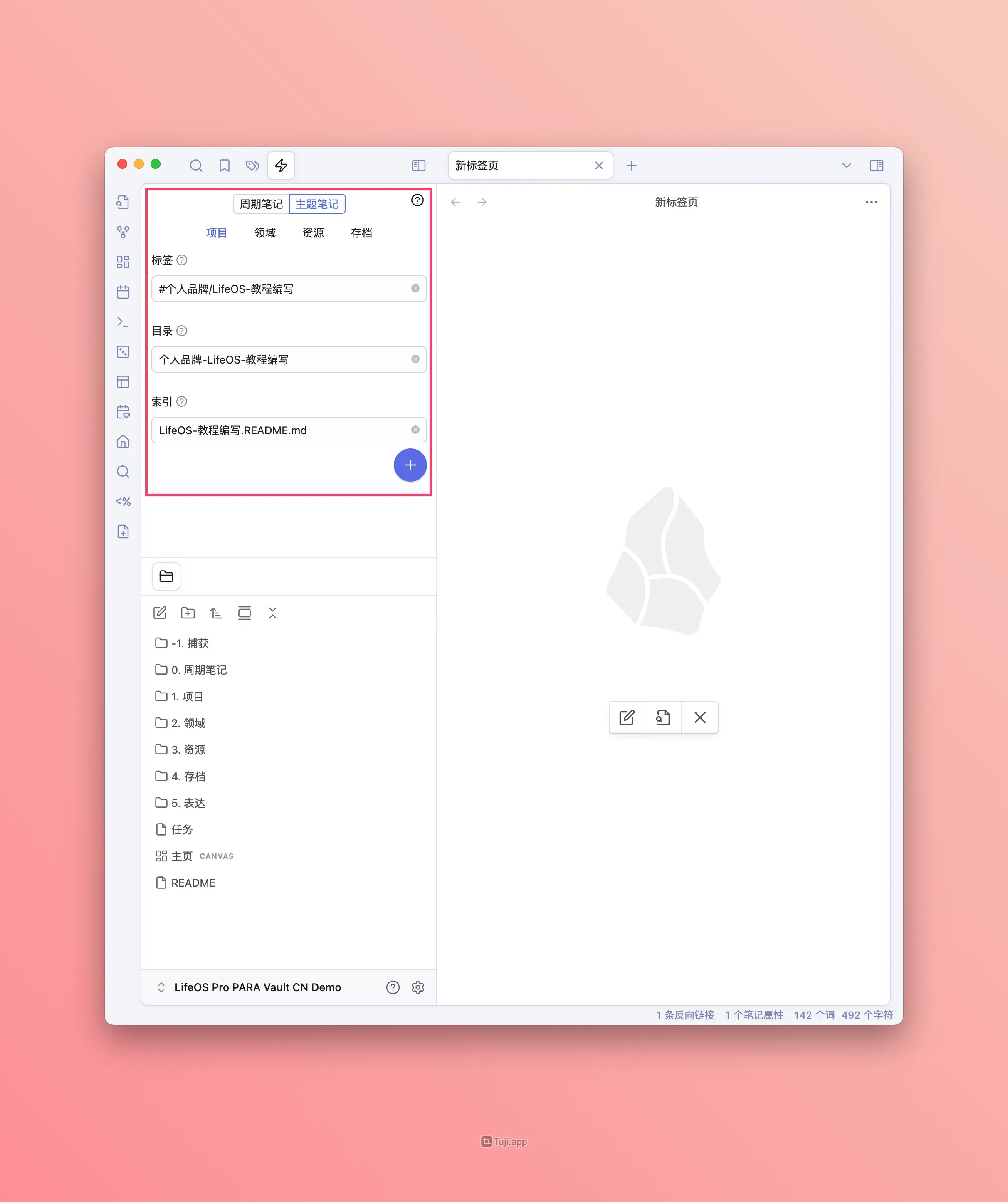 首先,我打开 Obsidian,通过左上角的『主题笔记』表单创建一个『个人品牌/LifeOS-教程编写』项目其中『个人品牌』即『领域』;