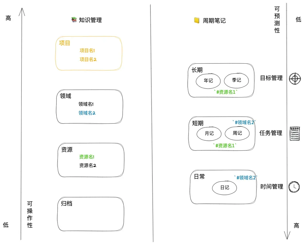 从图一中我们可以发现,对于知识管理系统来说,从『归档』、到『资源』、到『领域』、再到『项目』,对『知识笔记』的可操作性越来越高,如何理解可操作性呢?比如相比『育儿』领域下一步要做什么,和『育儿-筹办满月酒』这个项目的下一步,显然后者更具备可操作性!