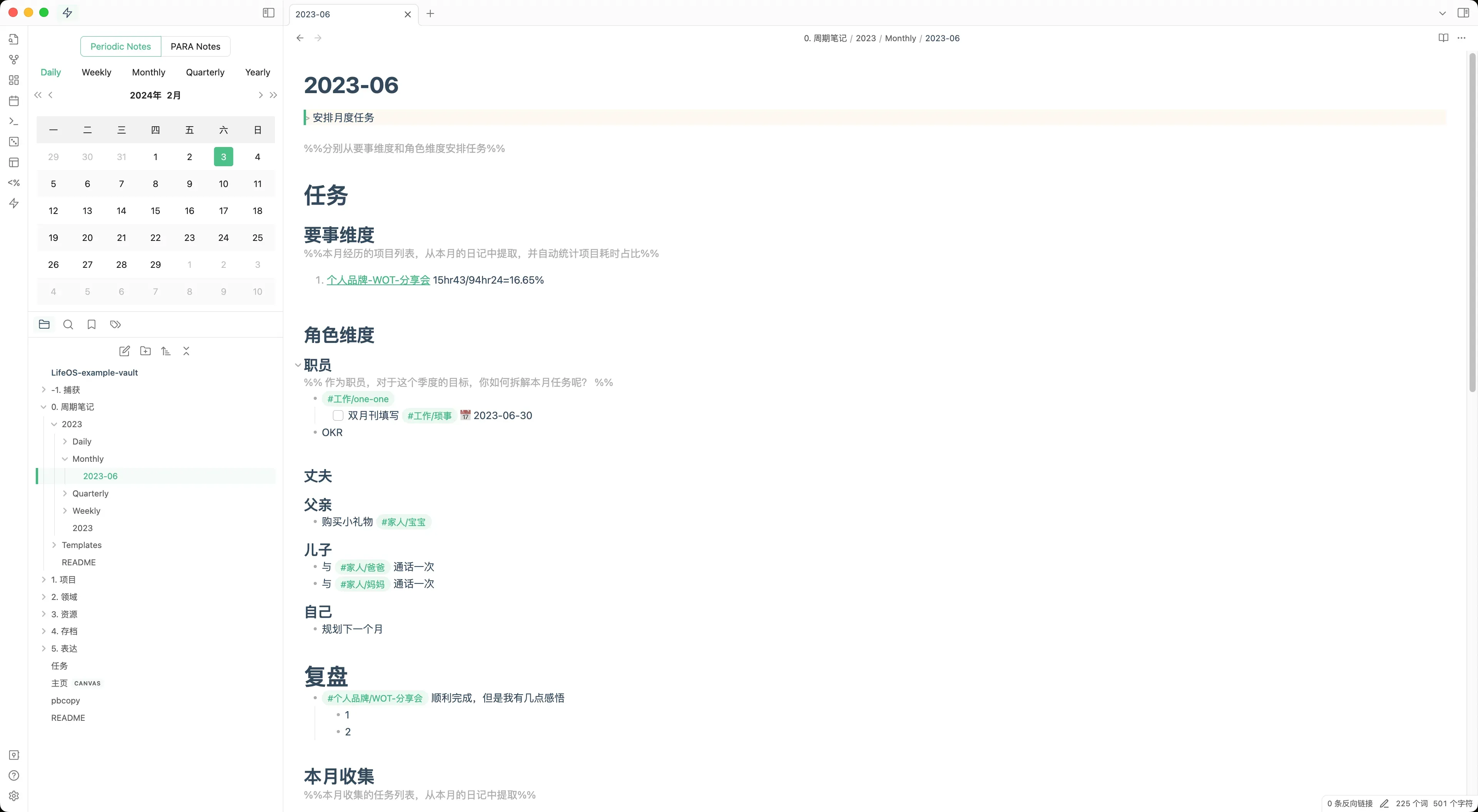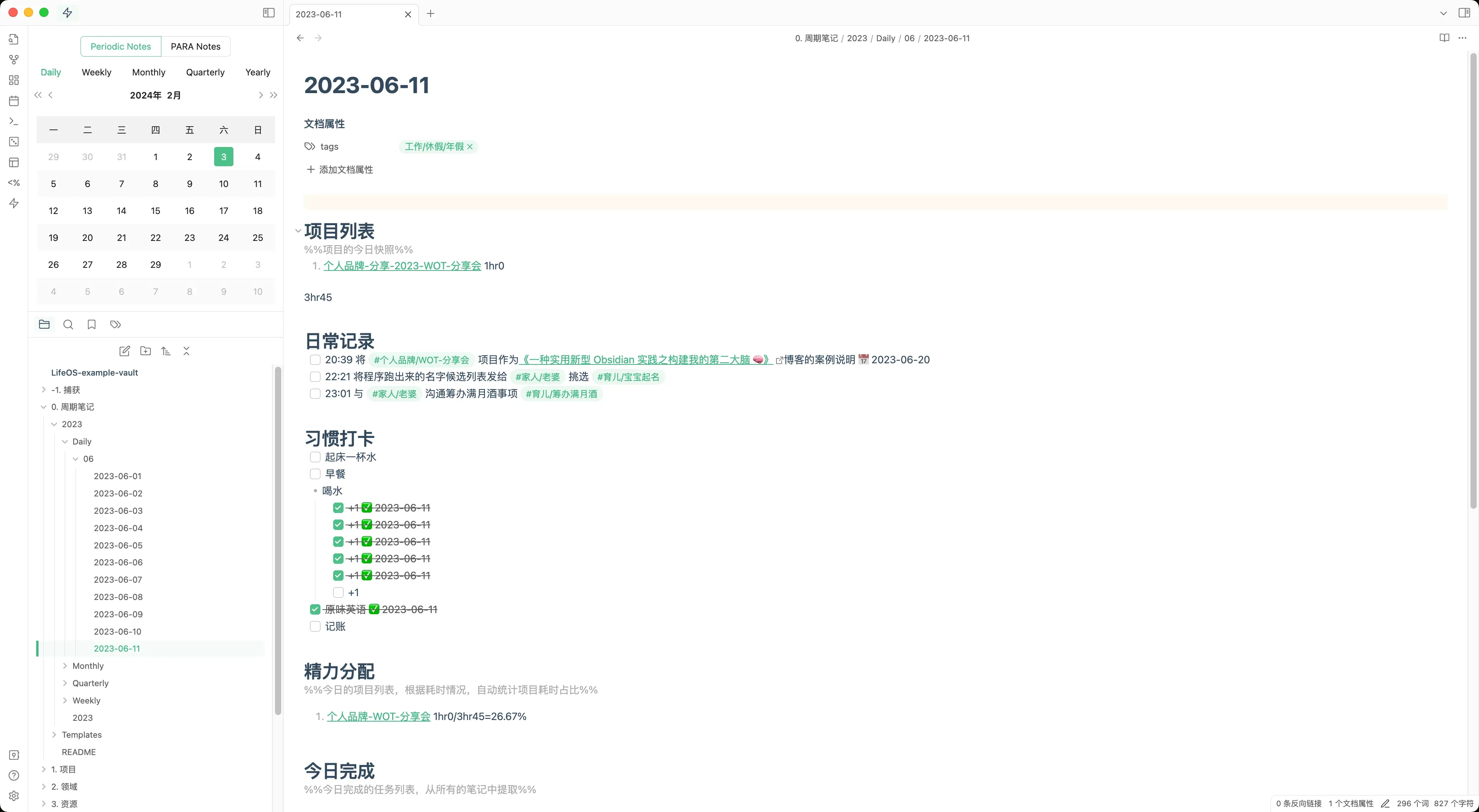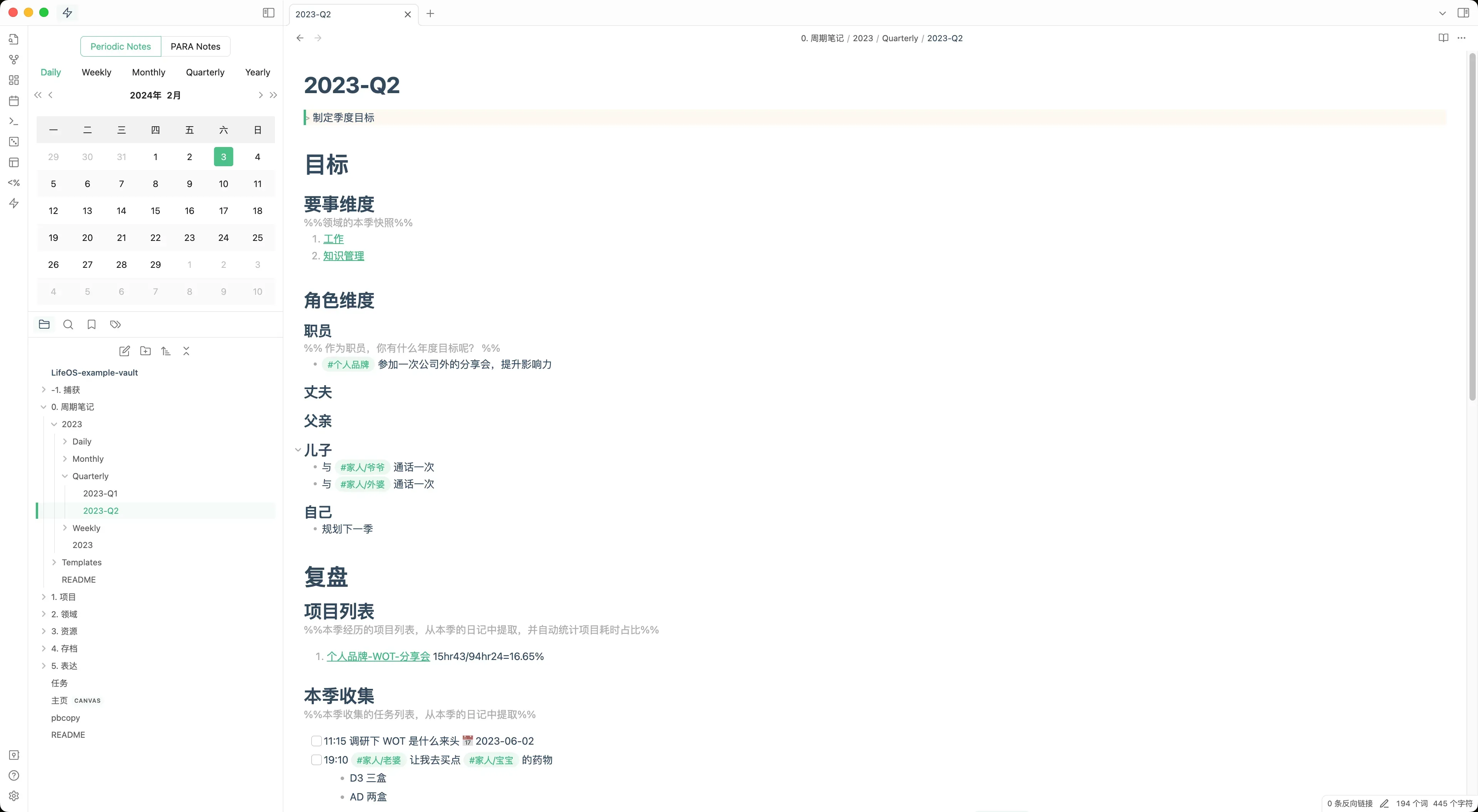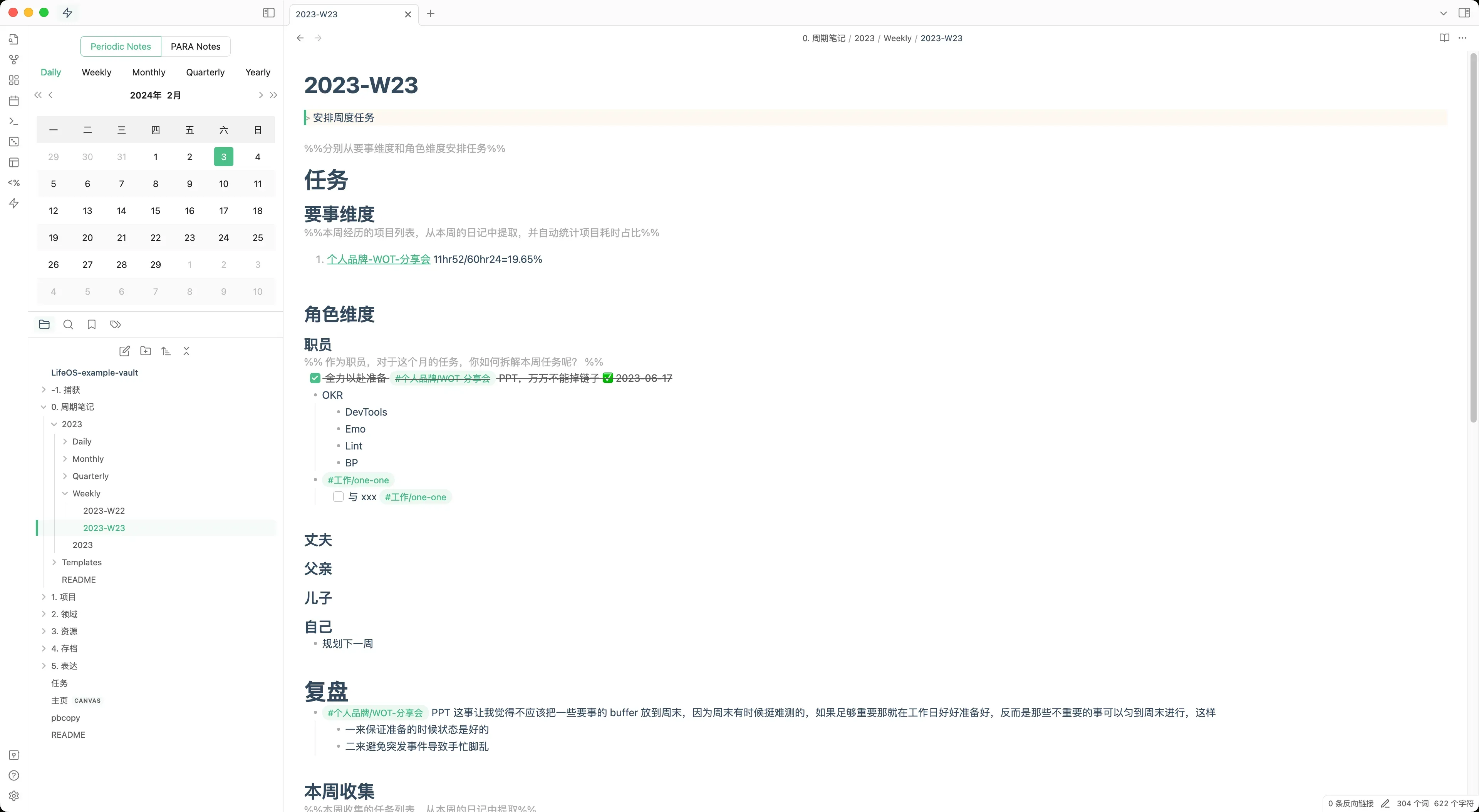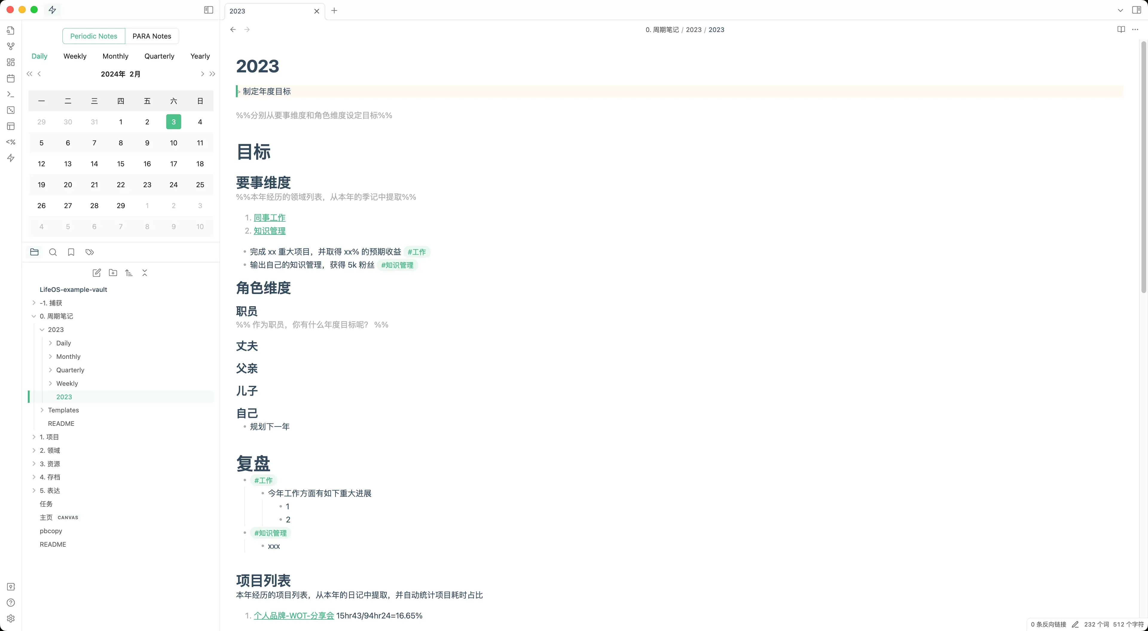 LifeOS 的核心采用两套系统,一个是知识管理系统,另一个是周期笔记系统,前者采用 PARA 系统,以『项目』、『领域』、『资源』为维度,进行知识管理,后者以时间为维度,通过记录『日记』、『周记』、『月记』、『季记』、『年记』,进行任务/目标/时间管理。