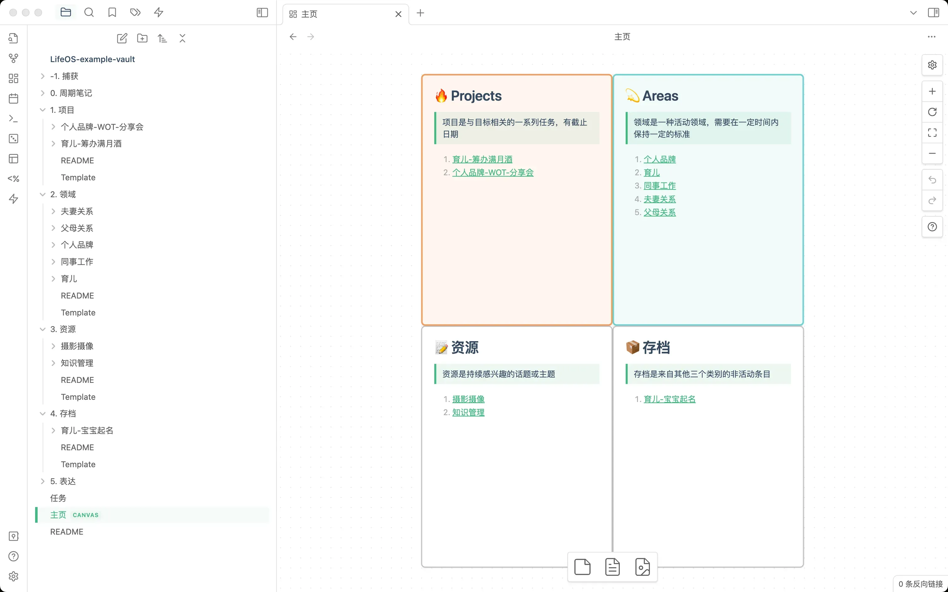 让我们对照着官方的定义,一起浏览一遍示例模版中的 PARA 笔记系统吧!