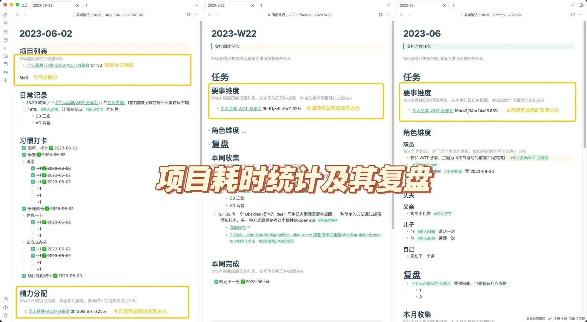 LifeOS 插件会读取步骤 2 中的数据,自动统计每个项目在「周记」、「月记」、「季记」、「年记」中的耗时占比。📉📆