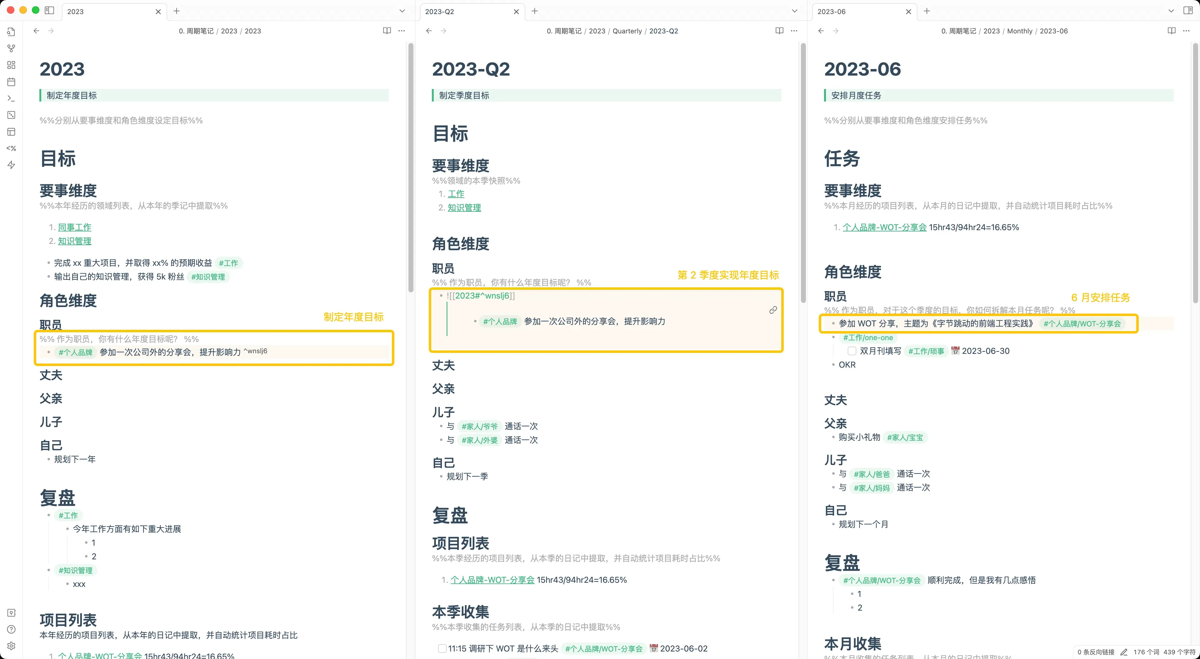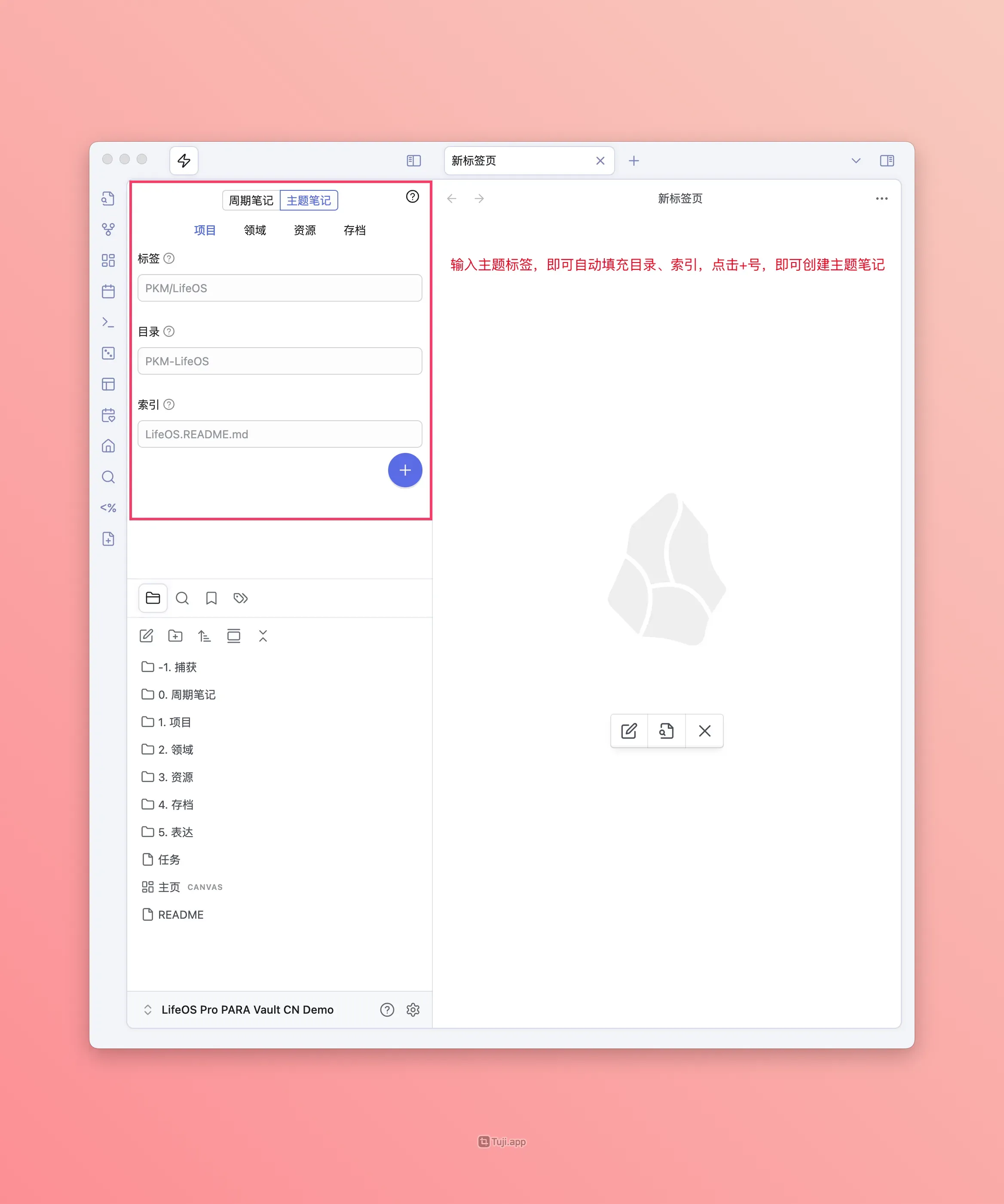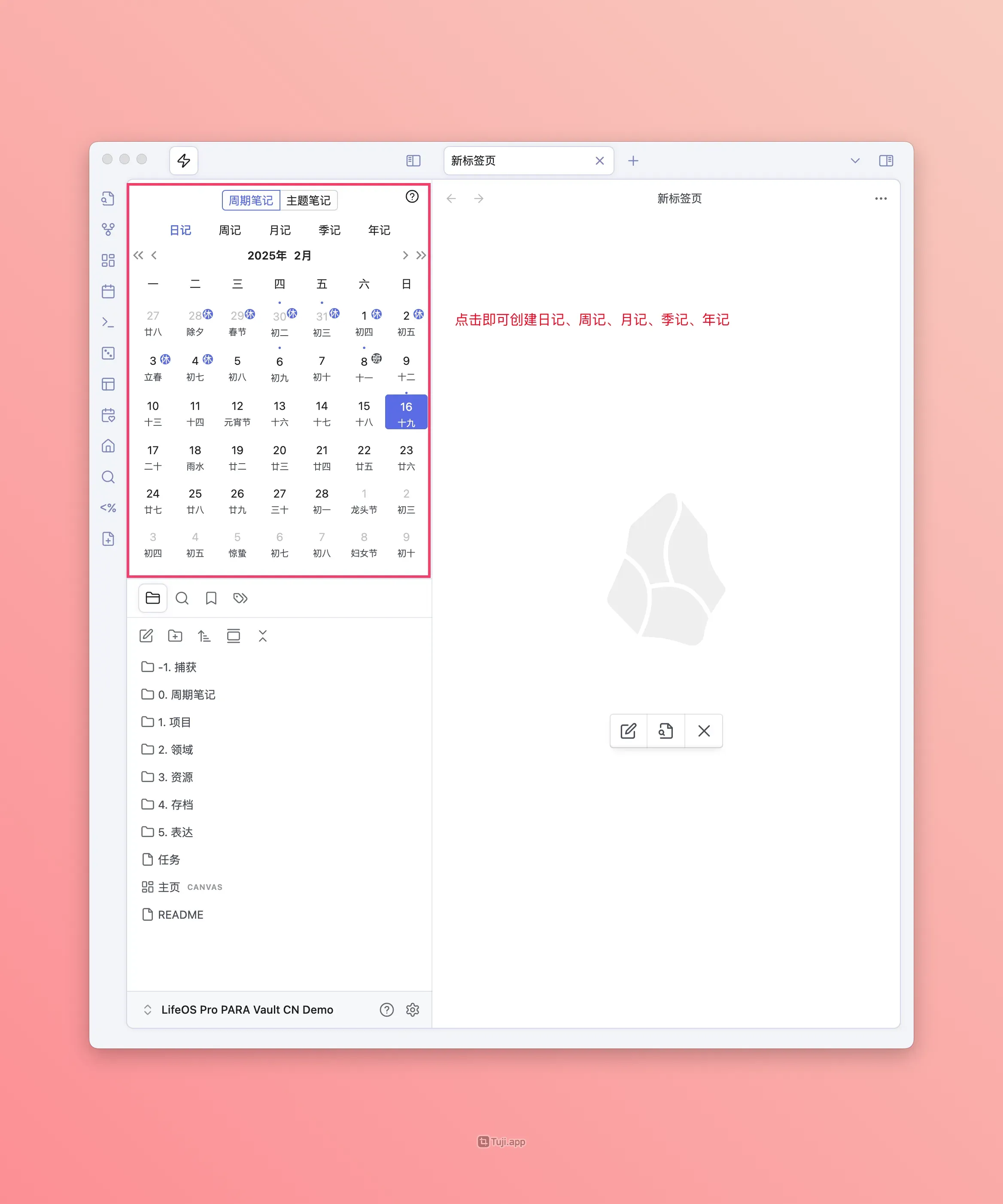 在左上角的表单(如果表单不存在,请点击左侧栏带+号的小图标,即可唤出),可以通过鼠标点击,轻松地创建周期笔记和主题笔记!