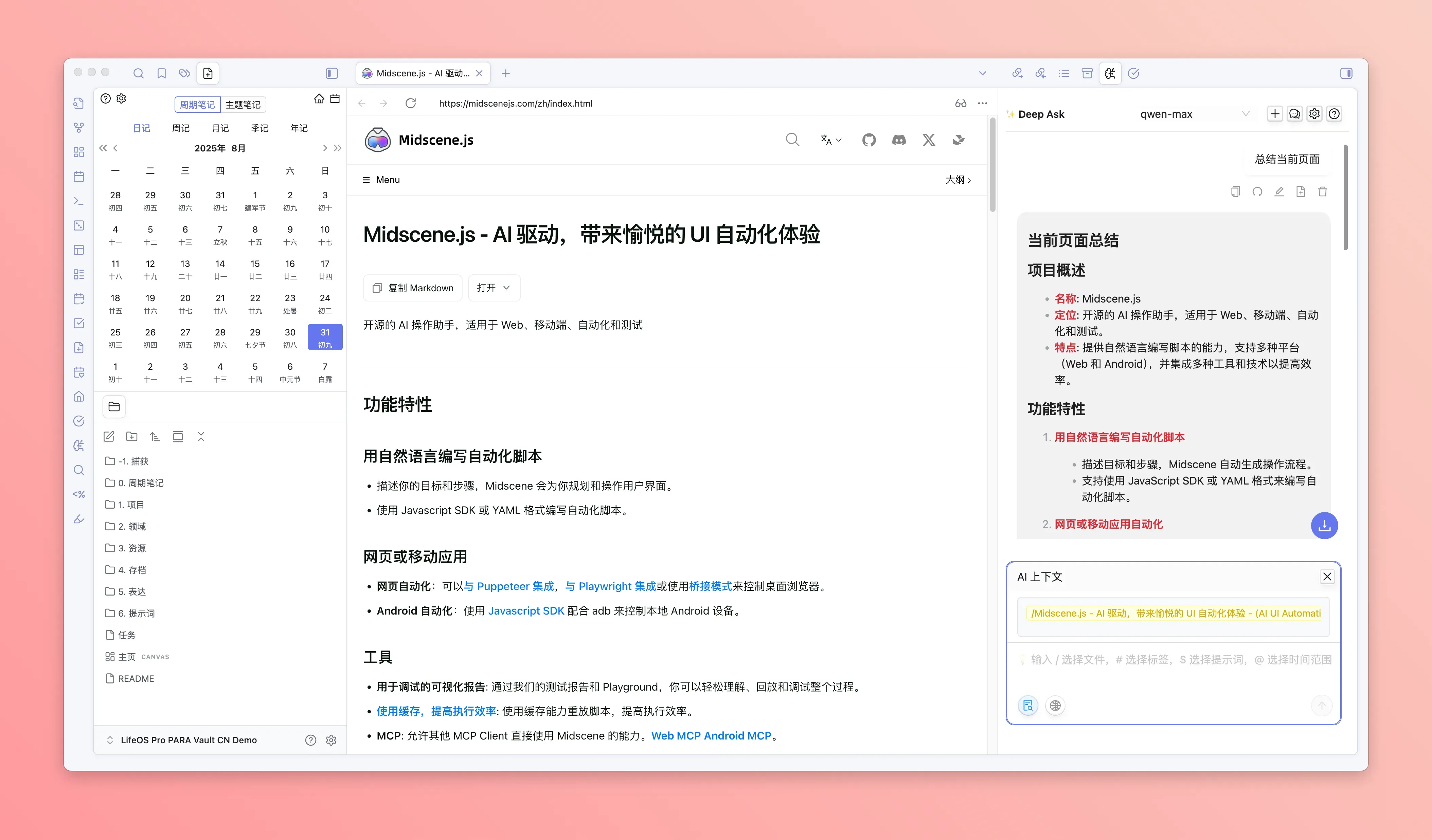 - Obsidian 集成: 支持从 Obsidian 链接标签、上下文和文件,在当前网页发起问答